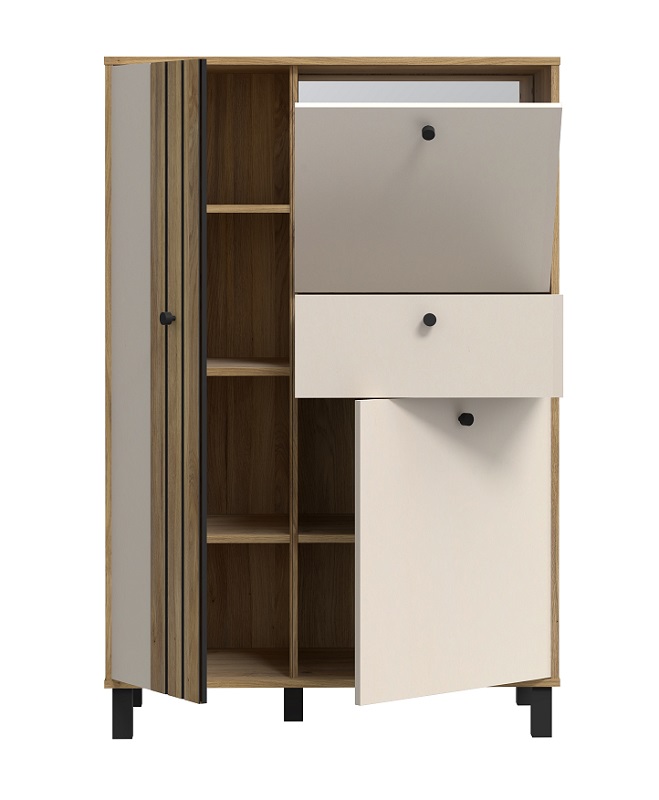 Komoda, będąca dwudrzwiowym rozwiązaniem, kryje w sobie bogactwo przestrzeni do przechowywania. Po otwarciu uchylnej klapy odkrywamy praktyczną przestrzeń, idealną do eksponowania dekoracji, szklanek czy innych drobiazgów. Jedna szuflada na dole dodaje dodatkowego miejsca na przechowywanie podręcznych rzeczy.