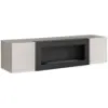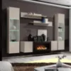 Detale: kompaktowe systemy zawierają m.in. meblościanki z biokominkiem, witryny szklane z opcją podświetlenia LED i mechanizm push-click umożliwiający otwieranie frontów bez uchwytów.