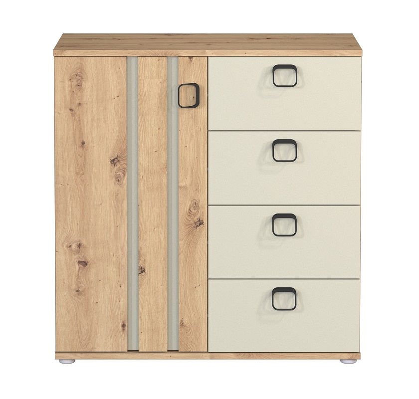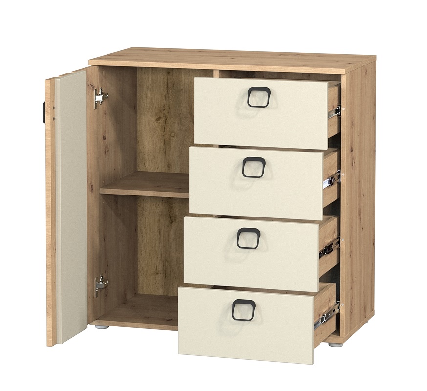 Komoda jest jednodrzwiowa, za uchylnymi drzwiami, znajduje się przestronna półka. Półka ta jest idealnym miejscem do przechowywania większych przedmiotów, takich jak książki, zeszyty czy gry planszowe. Oprócz tego komoda wyposażona jest w cztery praktyczne szuflady, które oferują dużo miejsca na mniejsze akcesoria, ubrania czy inne osobiste rzeczy. Dzięki temu komoda pomaga utrzymać porządek w pokoju młodzieżowym, zapewniając łatwy dostęp do wszystkich potrzebnych przedmiotów.