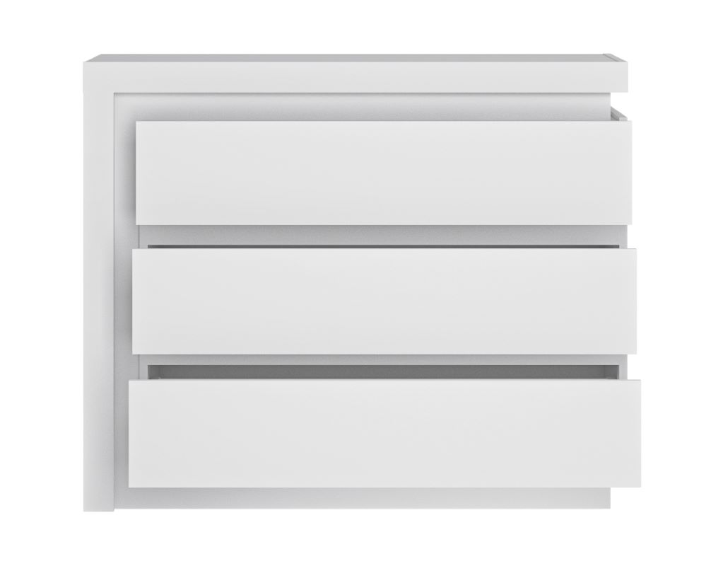 Komoda z szufladami to praktyczny mebel do przechowywania drobiazgów – biel korpusu i połyskowe fronty nadają jej elegancji. Szuflady poruszają się płynnie, a pojemność komody pozwala uporządkować ubrania, bieliznę lub tekstylia sypialniane.