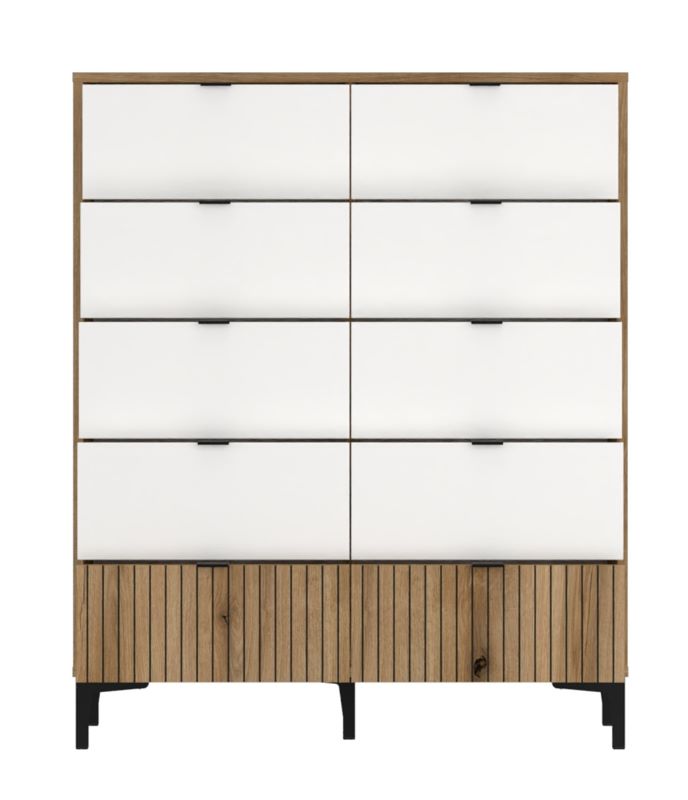 Ricko 10S wyróżnia się minimalistycznym, eleganckim designem, który łatwo dopasować do różnorodnych aranżacji wnętrz. Fronty z płyty laminowanej w połączeniu z uchwytami z tworzywa sztucznego nadają komodzie nowoczesny wygląd, a stopki z tworzywa sztucznego chronią podłogę i zapewniają stabilność.