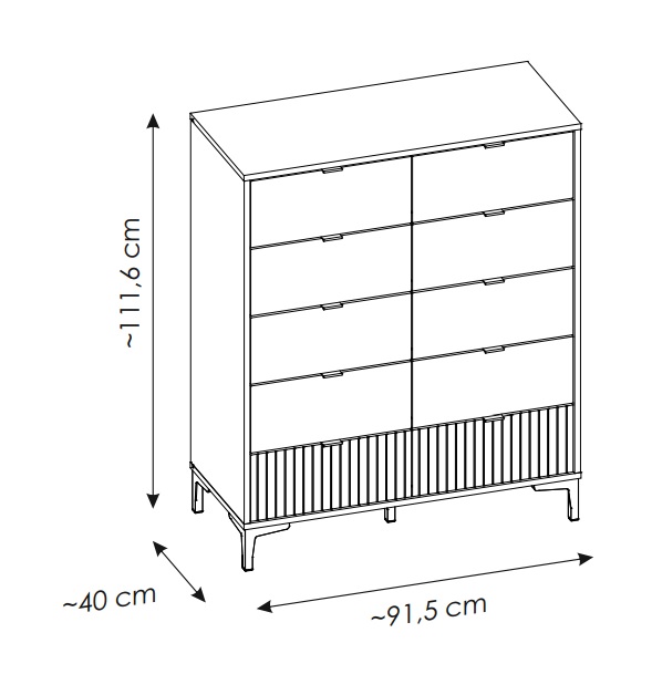 Komoda posiada dziesięć szuflad wyposażonych w prowadnice kulkowe z pełnym wysuwem, co umożliwia łatwy dostęp do zawartości i komfortowe użytkowanie. Pojemne szuflady pozwalają na przechowywanie odzieży, dokumentów, przyborów biurowych czy akcesoriów, pomagając utrzymać porządek w pomieszczeniu.