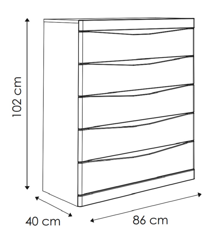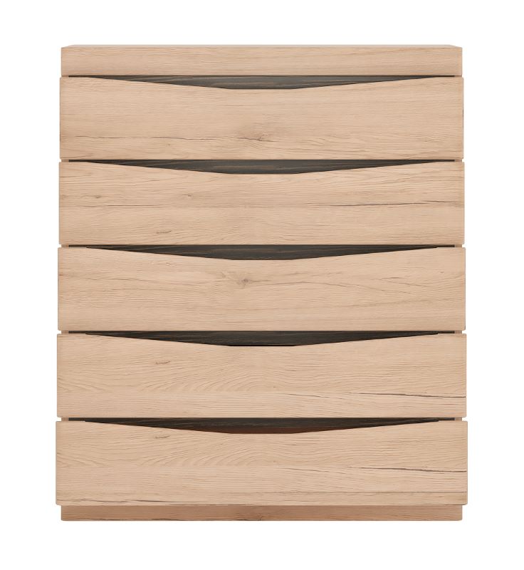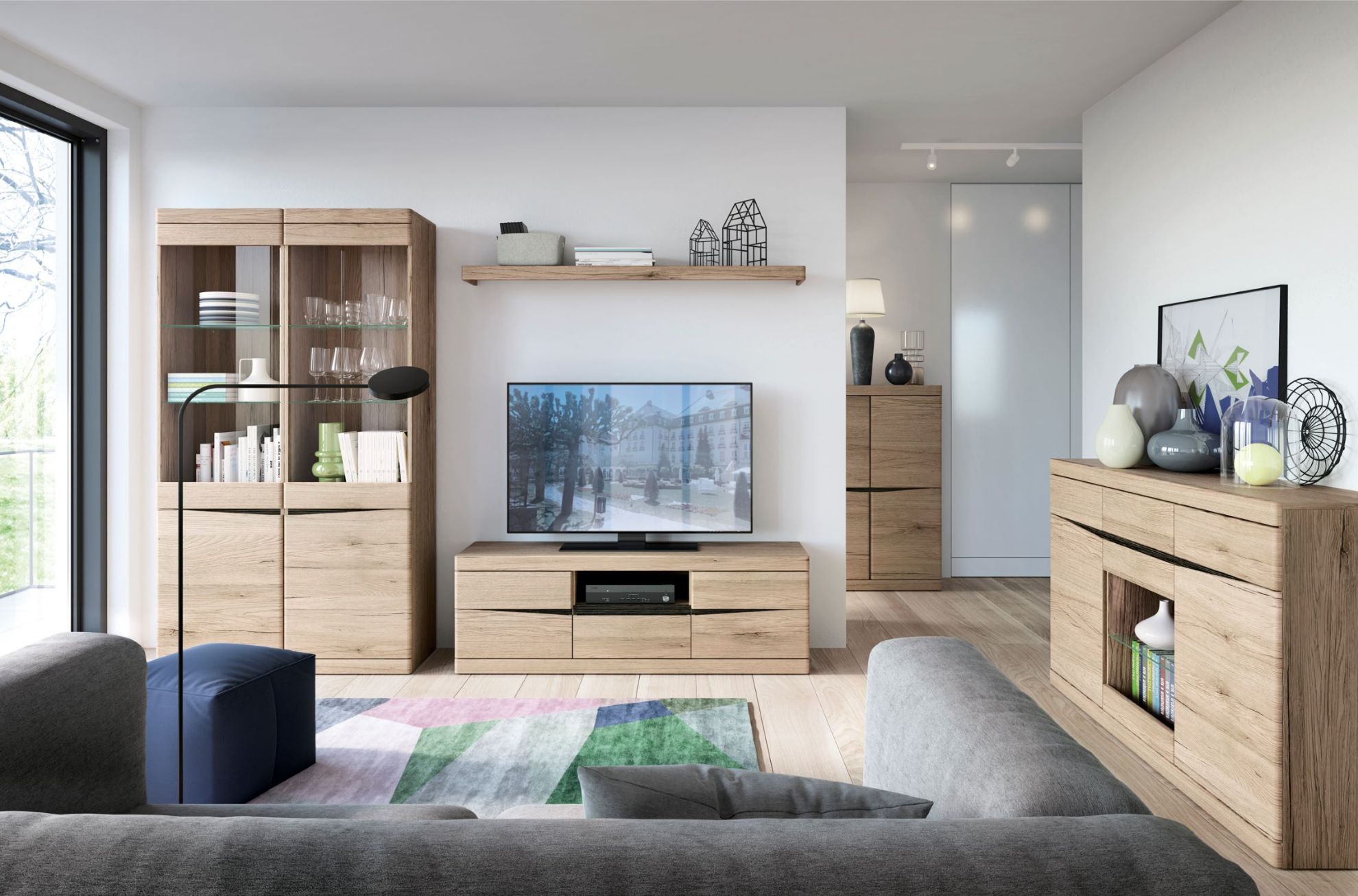 Efektowny, drewnopodobny dekor zachwyca realistycznym usłojeniem, które przywołuje na myśl ciepło natury. Kontrastowe wcięcia, pełniące rolę uchwytów, dodają kolekcji wyrazistego charakteru i podkreślają nowoczesną linię mebli. Przykuwają uwagę także szerokie poziome listwy, które świetnie współgrają z masywnymi frontami wykonanymi z trwałego MDF-u.