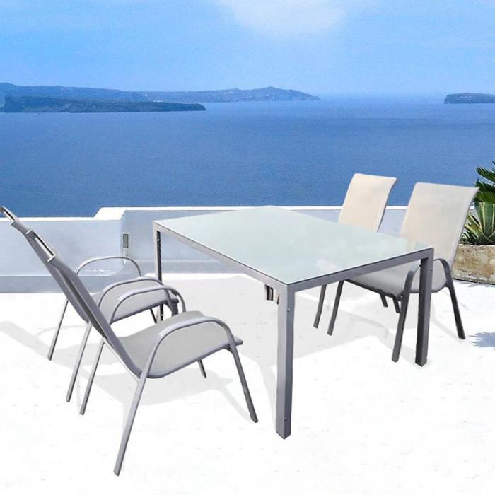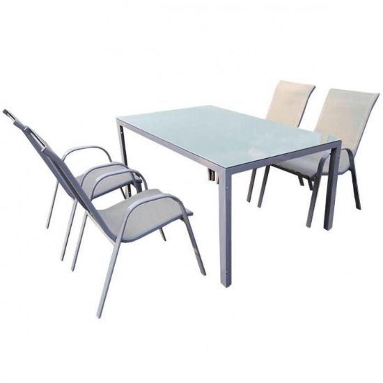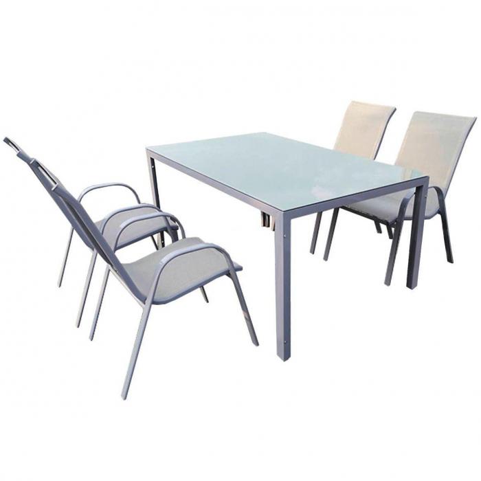 Elegancki stół ze szklanym blatem będzie pasował na niejeden taras lub ogród. Rama metalowa malowana proszkowo oraz blat malowany na matowy kolor dają ciekawy designu. Blat stołu wykonany został ze szkła hartowanego, które jest wytrzymalsze na uszkodzenia. Do kompletu są krzesła, których siedzisko i oparcie wykonane są tkaniny tekstylen.