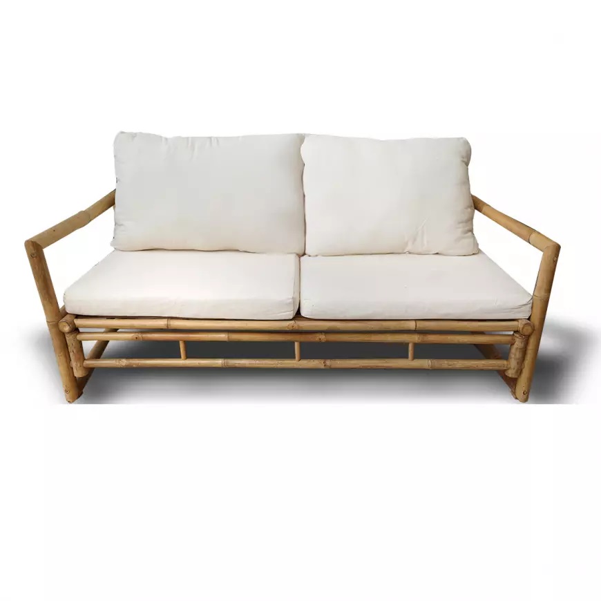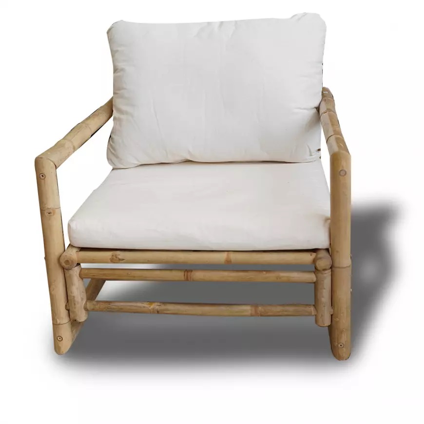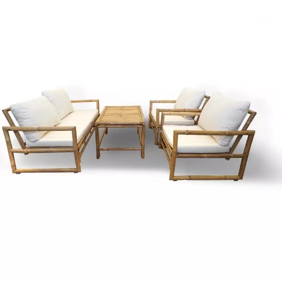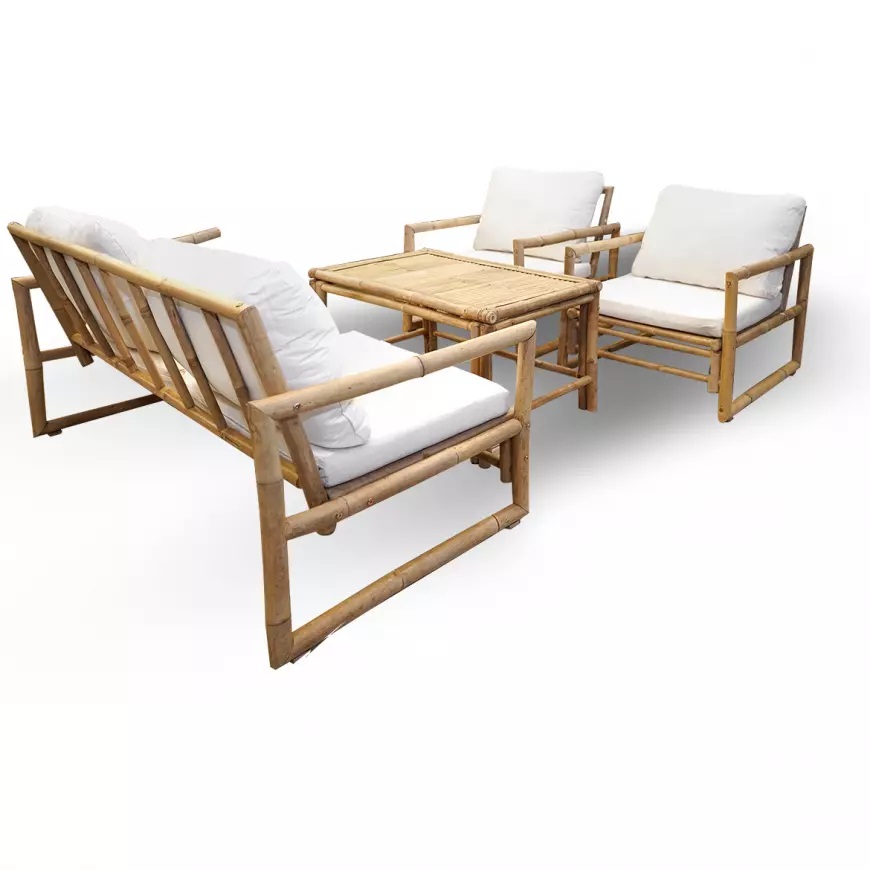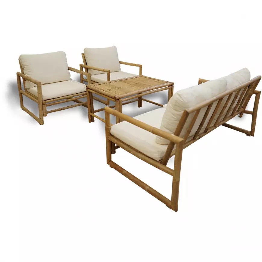 Komplet mebli zawiera kremowe poduszki, które dodają komfortu i elegancji, a ich neutralna barwa harmonizuje z bambusową konstrukcją, tworząc stylowy, a jednocześnie stonowany wygląd. Poduszki są miękkie i wygodne, co sprawia, że zestaw ten idealnie nadaje się do długich chwil relaksu na świeżym powietrzu.