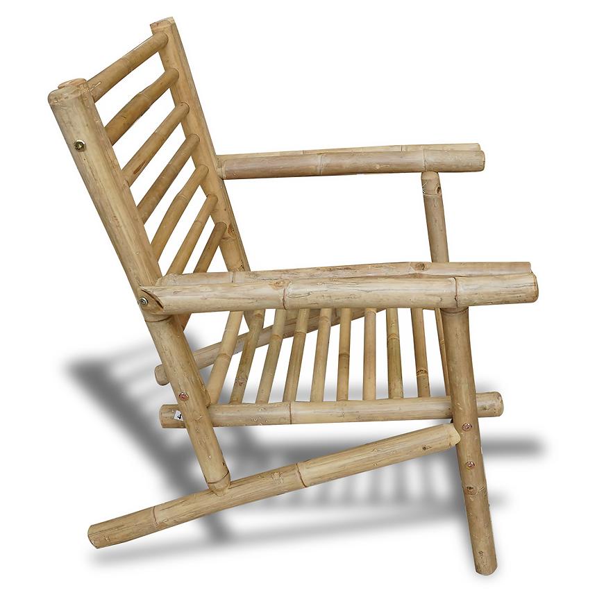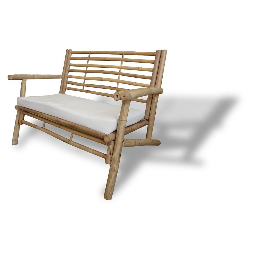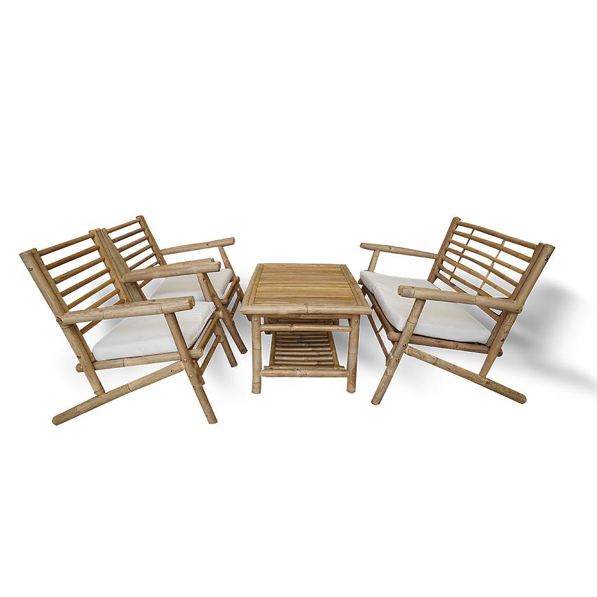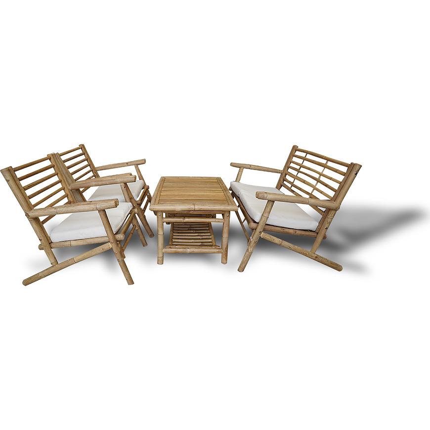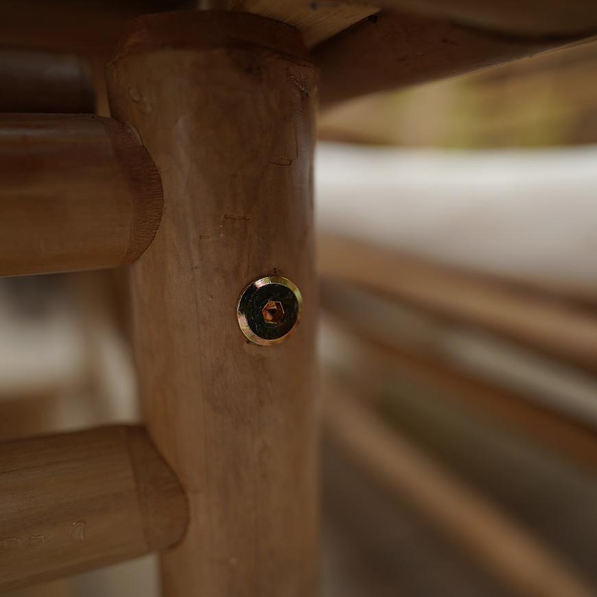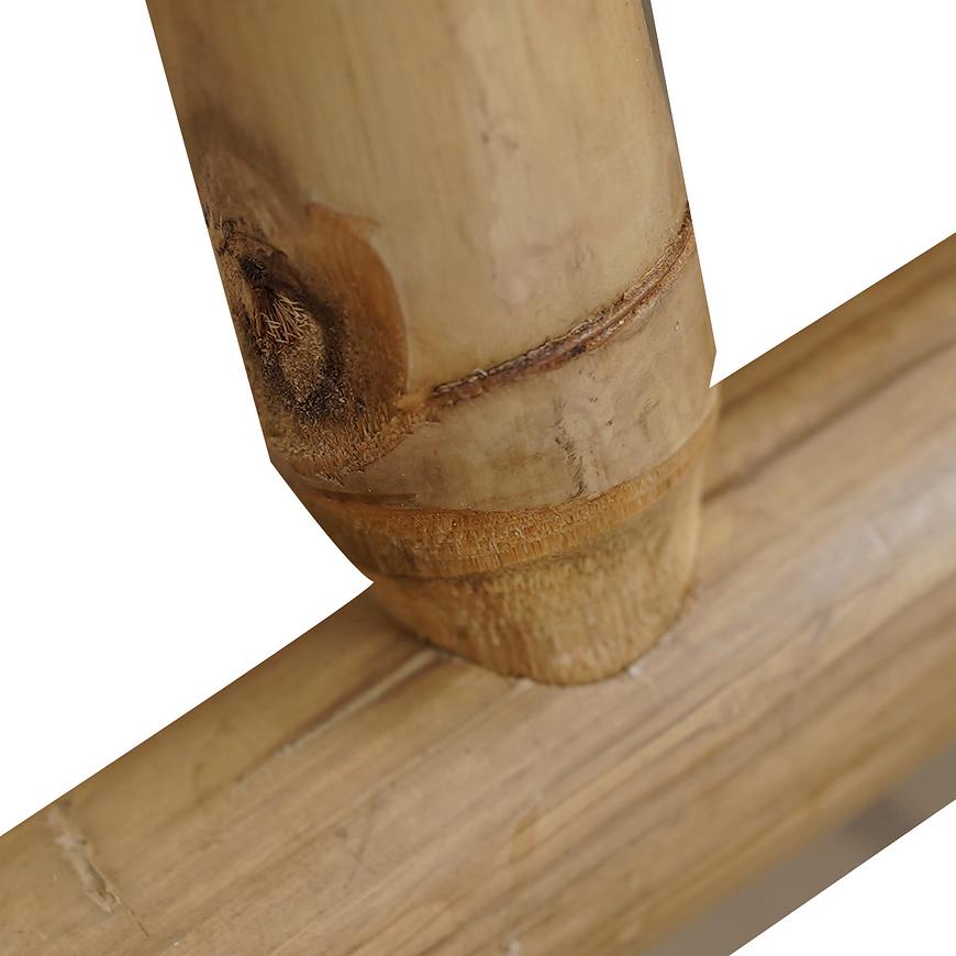 Konstrukcja mebli wykonana jest w całości z naturalnego drewna bambusowego, które słynie z wyjątkowej trwałości i odporności na zmienne warunki atmosferyczne. Bambusowy materiał wprowadza unikalny, naturalny urok, idealnie wpisując się w stylistykę ogrodową i tarasową. Kolor mebli utrzymany w naturalnych odcieniach bambusa doskonale współgra z kremowymi poduszkami dołączonymi do kompletu, podkreślając elegancki i przytulny charakter zestawu.