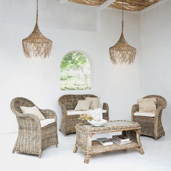 Sofa i fotele: Wymarzone miejsce do relaksu, zapraszające do zanurzenia się w przyjemnościach natury. Miękkie poduszki dodają komfortu, a ręcznie pleciony rattan - kubu nie tylko gwarantuje trwałość, ale także wyróżnia się swoją teksturą i głębią koloru, stając się prawdziwym dziełem sztuki.