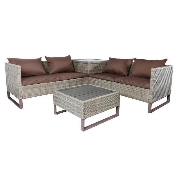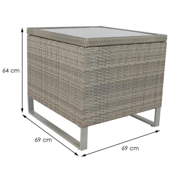 Otwierany stolik, który pełni również funkcję schowka, to narożny element zestawu. Blat stolika został wykonany z wytrzymałego szkła hartowanego. Dodatkowo, do kompletu został dołączony stolik kawowy, który wykonany jest z trwałego materiału polywood.