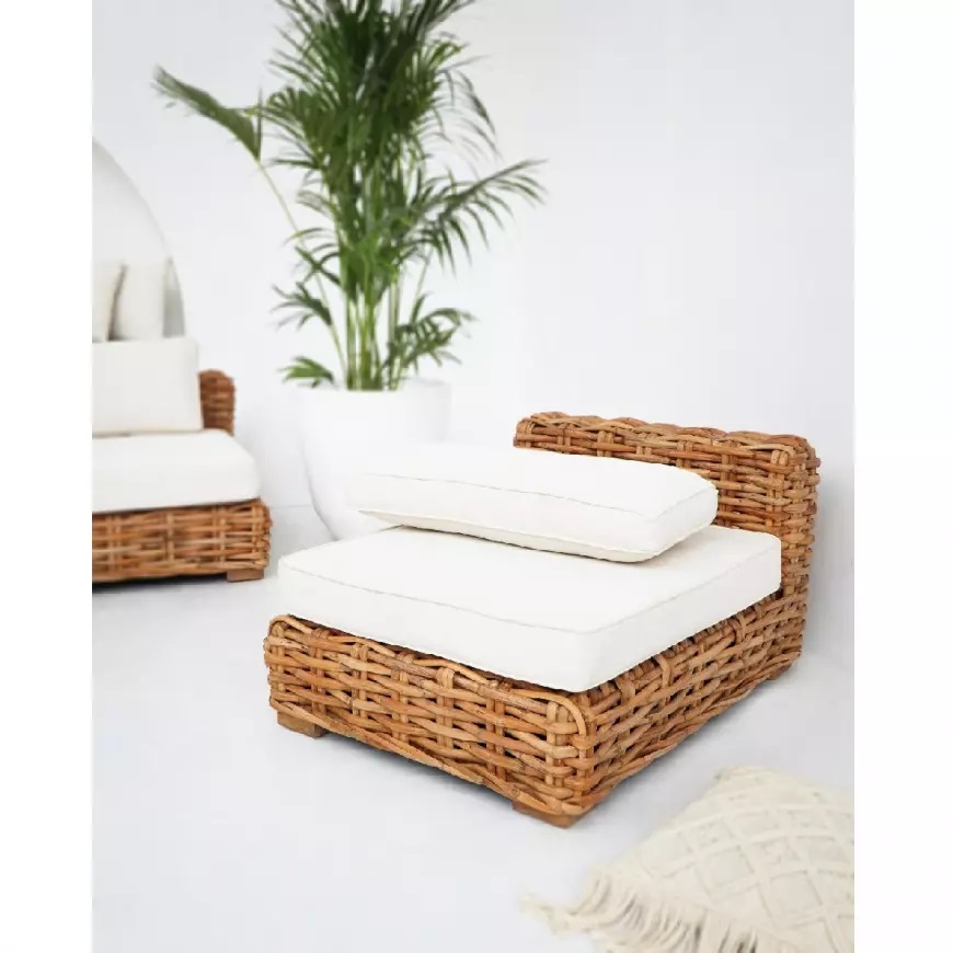 Meble Oceane wykonane są z wysokiej jakości naturalnego rattanu, który nie tylko nadaje im wyjątkowy, rustykalny wygląd, ale również zapewnia wytrzymałość na zmienne warunki atmosferyczne. Naturalny kolor rattanu doskonale komponuje się z różnorodnymi aranżacjami ogrodowymi, wprowadzając ciepły i przytulny klimat do każdej przestrzeni.