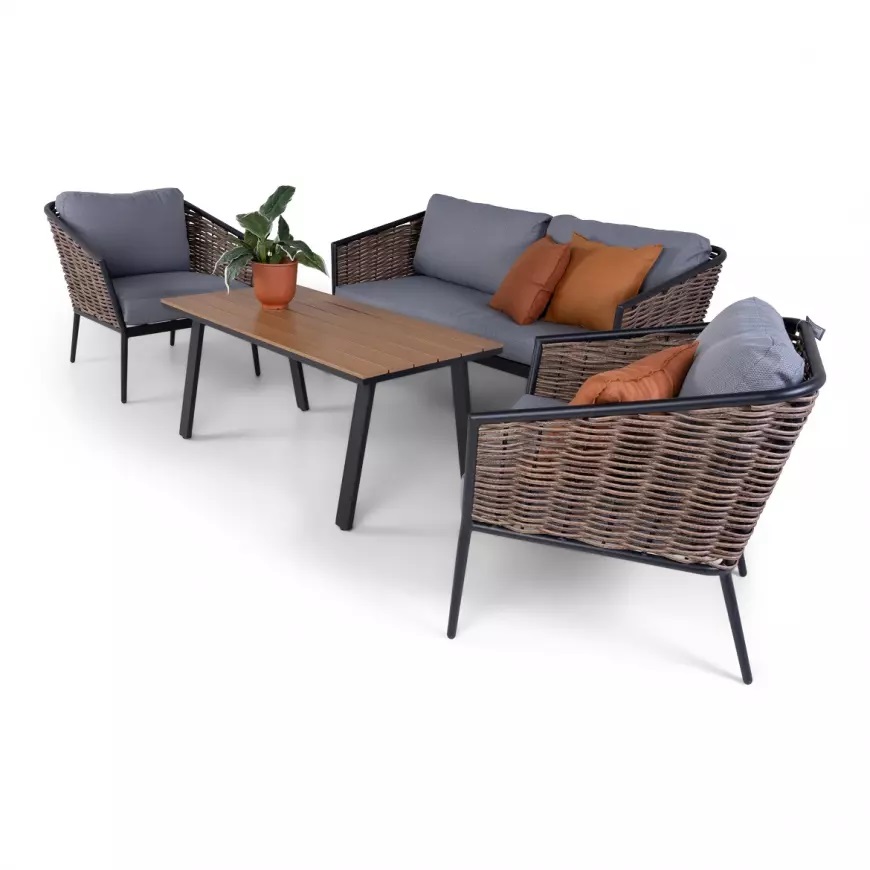 - Sofa: Wymiary 77x82x174 cm, zapewnia miejsce dla 4-5 osób, wyposażona w grube i wygodne poduszki w szarym kolorze.