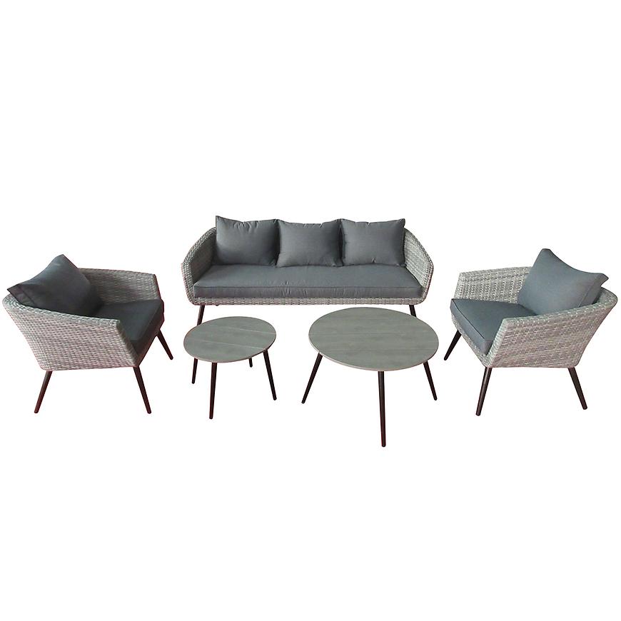 Zestaw składa się z eleganckiej sofy (182x78x70,5) dla trzech osób, dwóch komfortowych foteli oraz dwóch stylowych okrągłych stolików z blatem polywood. Każdy element zachwyca swoim wyglądem i solidnym wykonaniem, co sprawia, że zestaw jest nie tylko atrakcyjny wizualnie, ale również praktyczny w użytkowaniu.