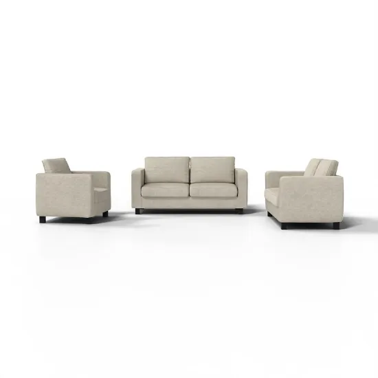 Komplet wypoczynkowy Mini Max 321 Astra 3 to propozycja dla osób, które cenią nowoczesny design, wygodę i funkcjonalność. Zestaw składa się z sofy głównej, sofy II oraz fotela, tworząc spójną i elegancką aranżację salonu. Beżowa tapicerka z wysokiej jakości tkaniny sprawia, że meble wpasują się zarówno w klasyczne, jak i nowoczesne wnętrza, wprowadzając przytulny i ciepły klimat.
