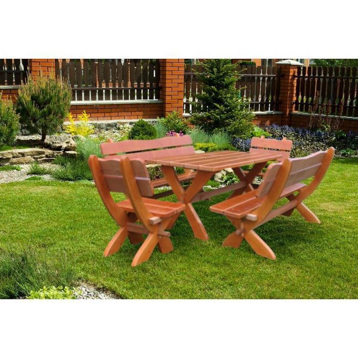 Zestaw mebli idealny na ogród lub taras. W całości wykonany z litego drewna świerkowego. Komplet składa się ze stołu, dwóch krzeseł i dwóch ławek.