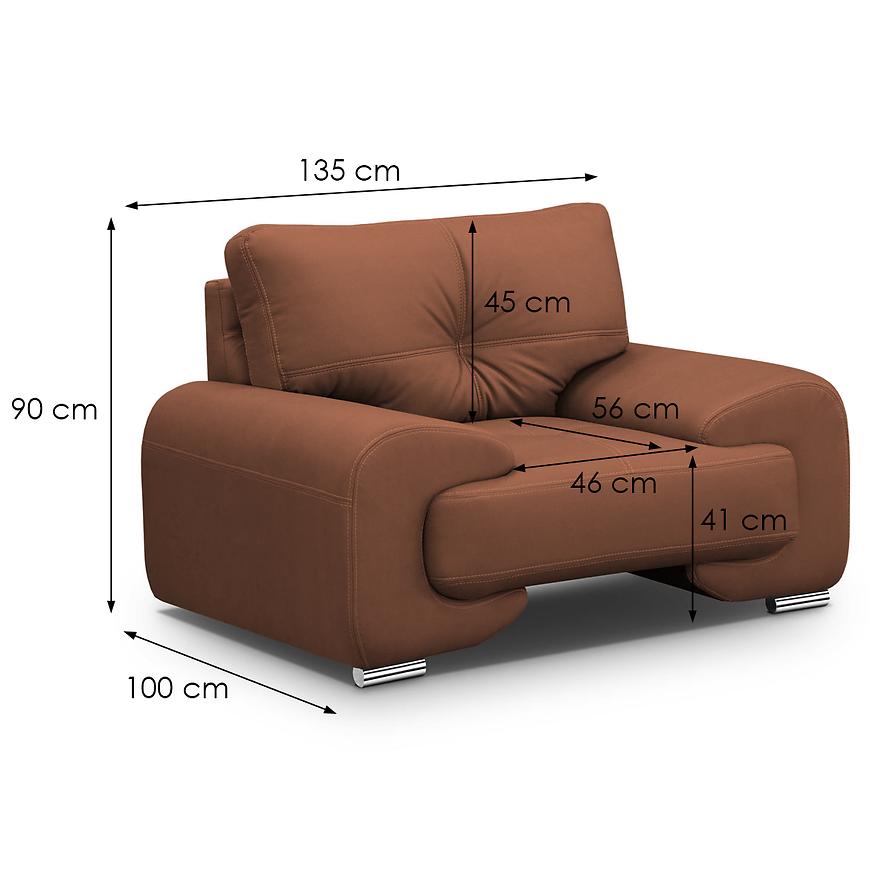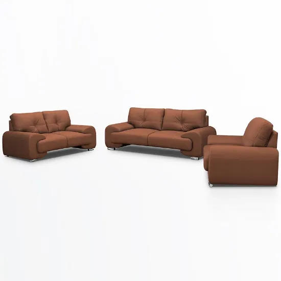 Komplet wypoczynkowy Omega Lux New 3+2+1 Vega 56 w efektownym rudym kolorze to stylowe i eleganckie rozwiązanie do przestronnych salonów. Zestaw składa się z trzech elementów – dużej sofy trzyosobowej (230 cm), dwuosobowej (190 cm) oraz wygodnego fotela (135 cm szerokości). Tapicerka z trwałej ekoskóry w połączeniu z wypełnieniem ze sprężyny falistej i pianki HR gwarantuje wysoki komfort siedzenia i odporność na odkształcenia. Meble nie posiadają funkcji spania ani schowków, co podkreśla ich nowoczesny, minimalistyczny charakter. Stabilne srebrne nogi i brak konieczności montażu czynią komplet jeszcze bardziej funkcjonalnym. Omega Lux to idealny wybór do eleganckich wnętrz, gdzie liczy się design, wygoda i ponadczasowy styl.