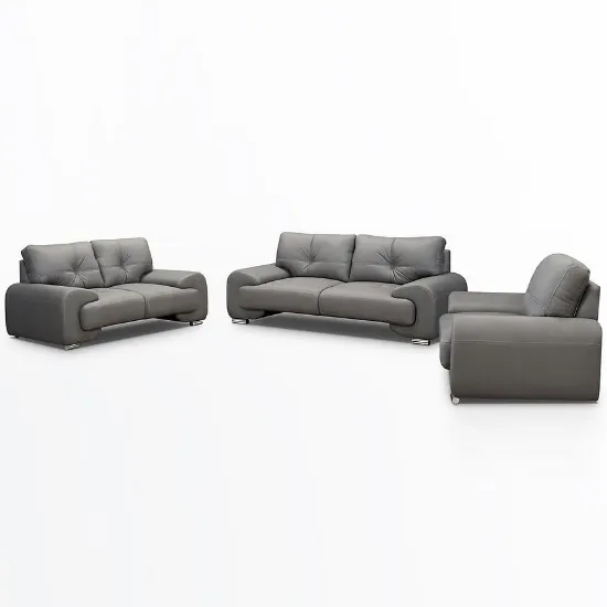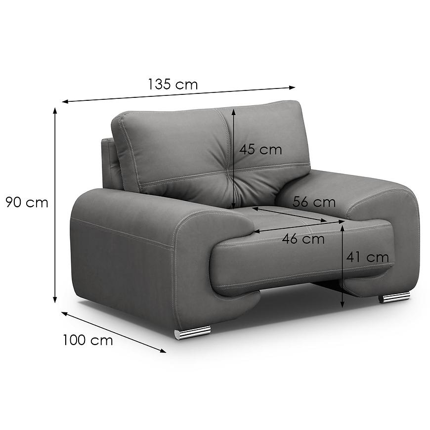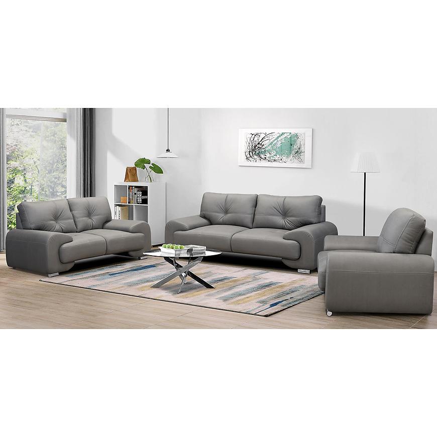 Komplet wypoczynkowy Omega Lux New 3+2+1 Vega 88 w eleganckim szarym kolorze to doskonałe połączenie nowoczesnego designu i wygody. Zestaw składa się z przestronnej sofy trzyosobowej (230 cm), mniejszej dwuosobowej (190 cm) oraz szerokiego fotela (135 cm), co gwarantuje komfort dla całej rodziny. Tapicerka z trwałej ekoskóry oraz wypełnienie ze sprężyny falistej i pianki HR zapewniają długotrwałą sprężystość i wygodę użytkowania. Brak funkcji spania i schowków podkreśla minimalistyczny styl mebli. Stabilne srebrne nogi dodają elegancji, a gotowy do użycia komplet nie wymaga montażu. Idealny wybór do nowoczesnych i klasycznych wnętrz.
