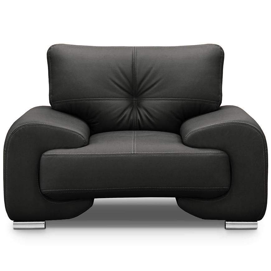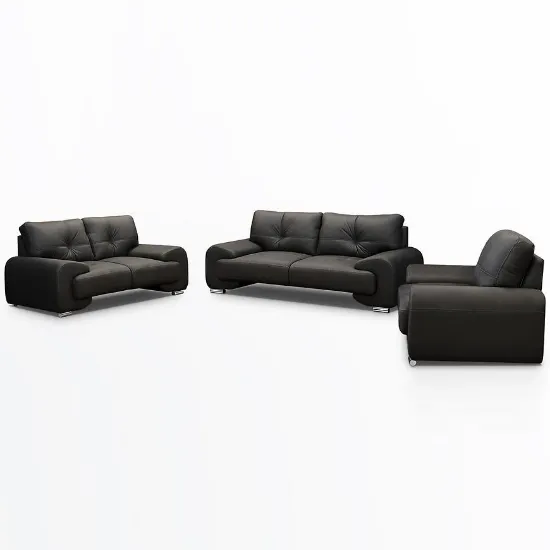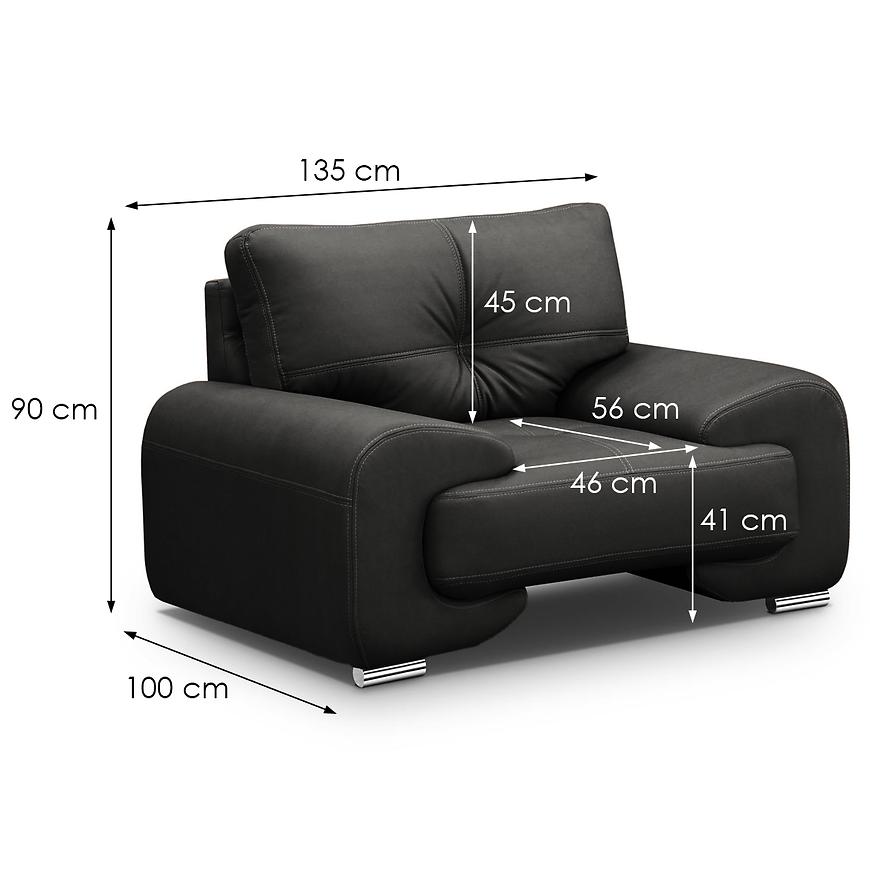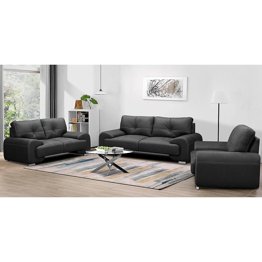 Komplet wypoczynkowy Omega Lux New 3+2+1 Vega 99 w eleganckim czarnym kolorze to doskonałe połączenie stylu, komfortu i funkcjonalności. W zestawie znajduje się przestronna sofa trzyosobowa (230 cm), wygodna sofa dwuosobowa (190 cm) oraz szeroki fotel (135 cm), co zapewnia wygodne miejsce do siedzenia dla całej rodziny lub gości. Tapicerka z wysokiej jakości ekoskóry dodaje wnętrzu nowoczesnego charakteru i jest łatwa w pielęgnacji. Wypełnienie z pianki HR i sprężyn falistych gwarantuje optymalne podparcie i długotrwały komfort użytkowania. Solidne srebrne nogi dodają lekkości i stylowego wyglądu. Komplet nie posiada funkcji spania ani schowków na pościel, co czyni go idealnym wyborem do codziennego wypoczynku w salonie. Produkt dostarczany w całości – nie wymaga montażu. Idealny do wnętrz w stylu nowoczesnym, glamour lub loftowym.