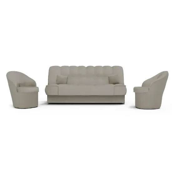 Zestaw nie zajmuje wiele miejsca, a jednocześnie oferuje wygodne siedziska i możliwość rozłożenia sofy, co przyda się w mniejszych mieszkaniach, kawalerkach lub pokojach gościnnych.