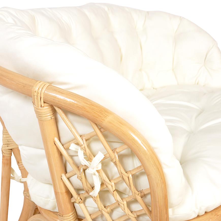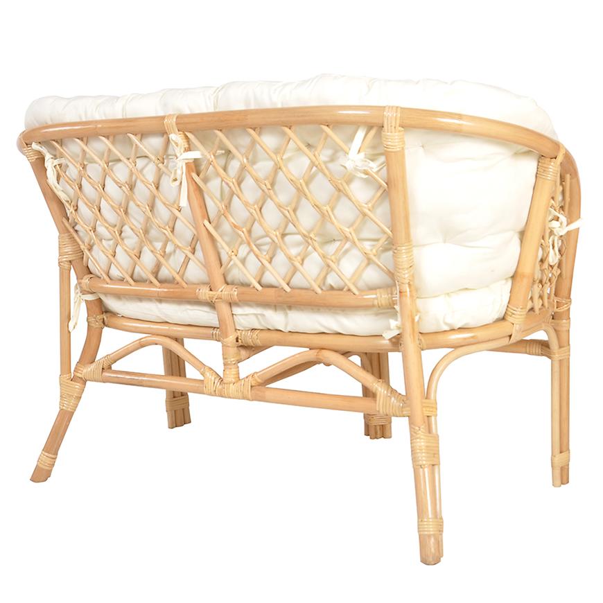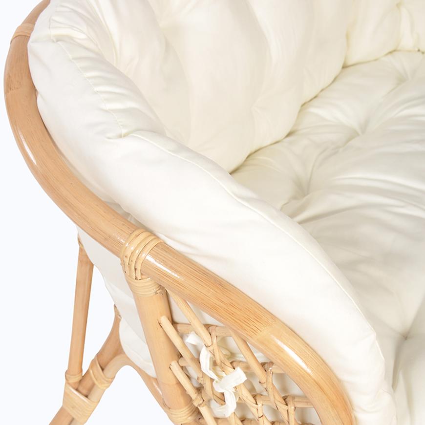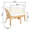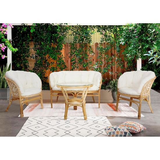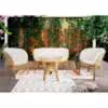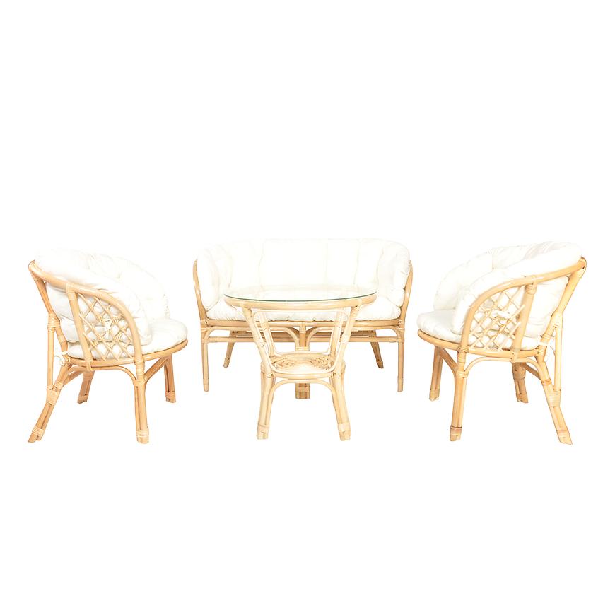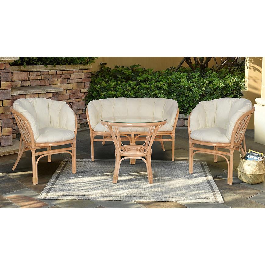 Każdy element zestawu, od sofy po fotele, został precyzyjnie wypleciony ręcznie, co podkreśla jego unikalny charakter. Naturalny kolor rattanu harmonizuje z beżowymi poduszkami, które są nie tylko stylowe, ale również zapewniają dodatkowy komfort użytkowania.