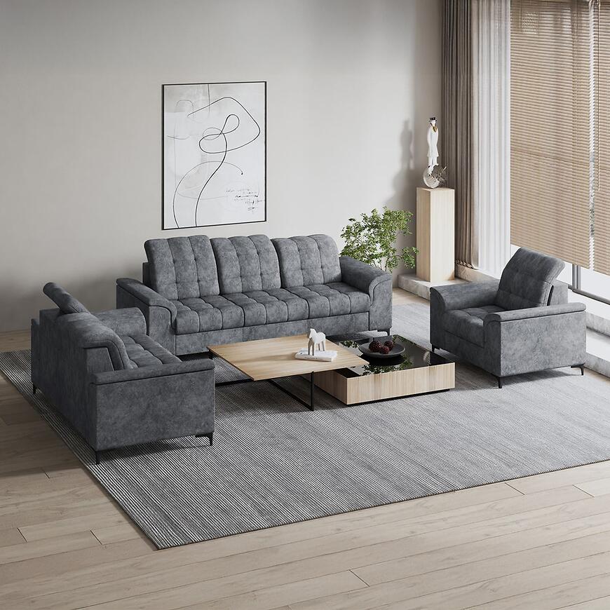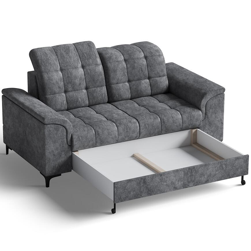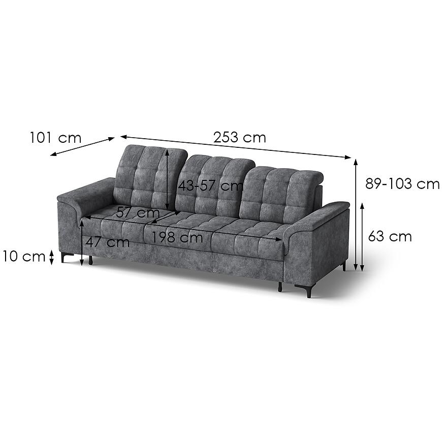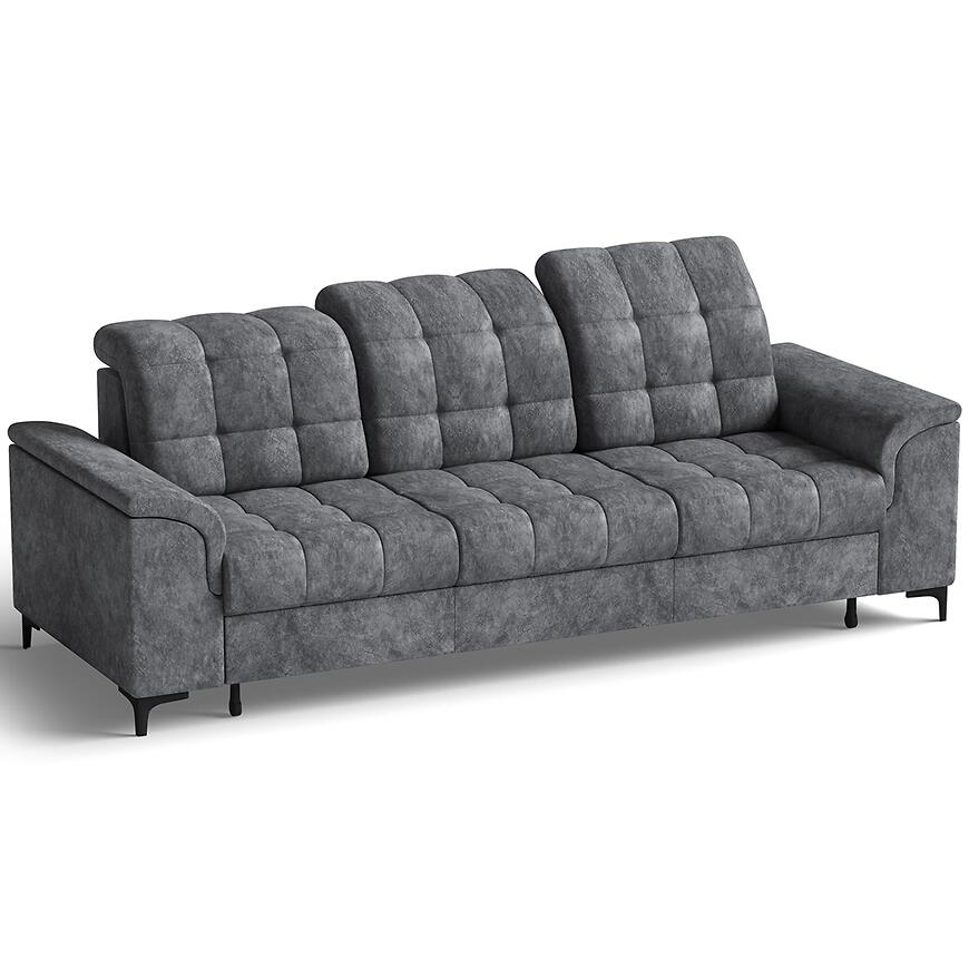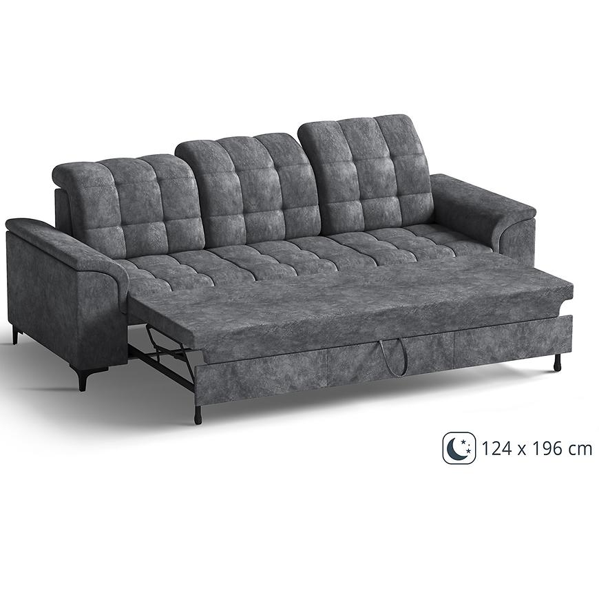 Komplet wypoczynkowy Snap 3+2+1 Bangkok Ash to harmonijne połączenie nowoczesnego stylu, wygody i praktycznych rozwiązań. W zestawie znajduje się duża sofa z funkcją spania o powierzchni 196x124 cm, mniejsza sofa oraz komfortowy fotel. Tapicerka z tkaniny w eleganckim odcieniu szarym nadaje całości ponadczasowego charakteru, a wypełnienie oparte na sprężynie falistej gwarantuje wysoki komfort użytkowania. Zestaw posiada regulowane zagłówki, pojemny schowek na pościel oraz stabilne czarne nogi podkreślające nowoczesny wygląd. Dzięki mechanizmowi delfin sofy rozkładają się szybko i wygodnie, czyniąc komplet zarówno stylowym, jak i funkcjonalnym.