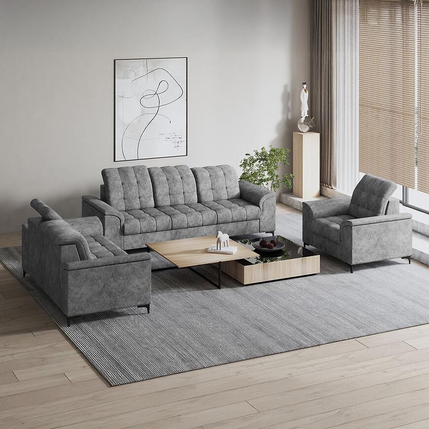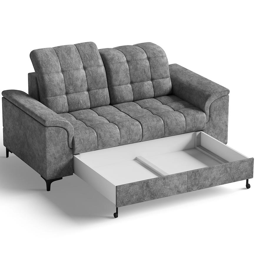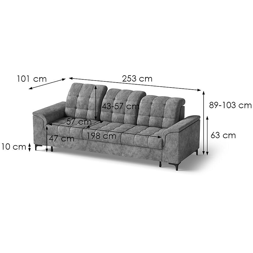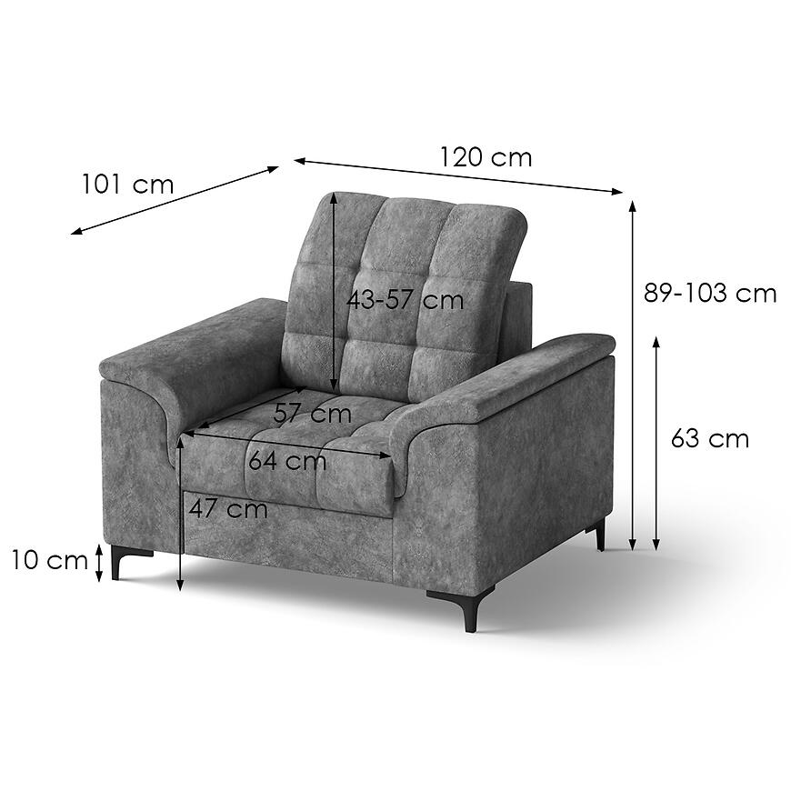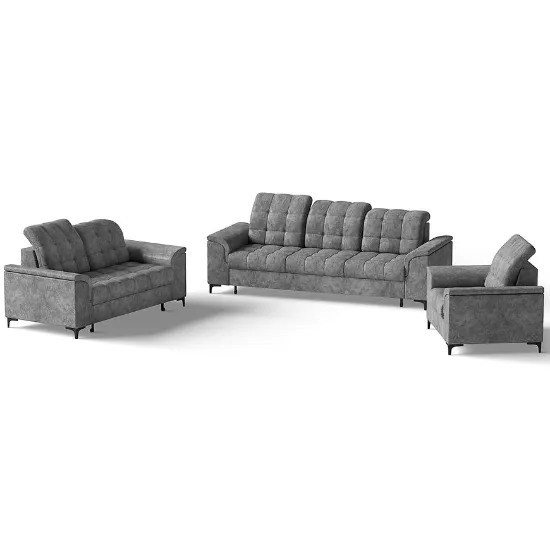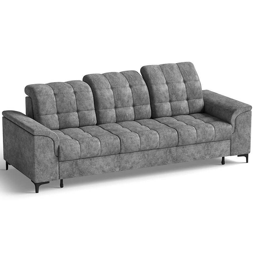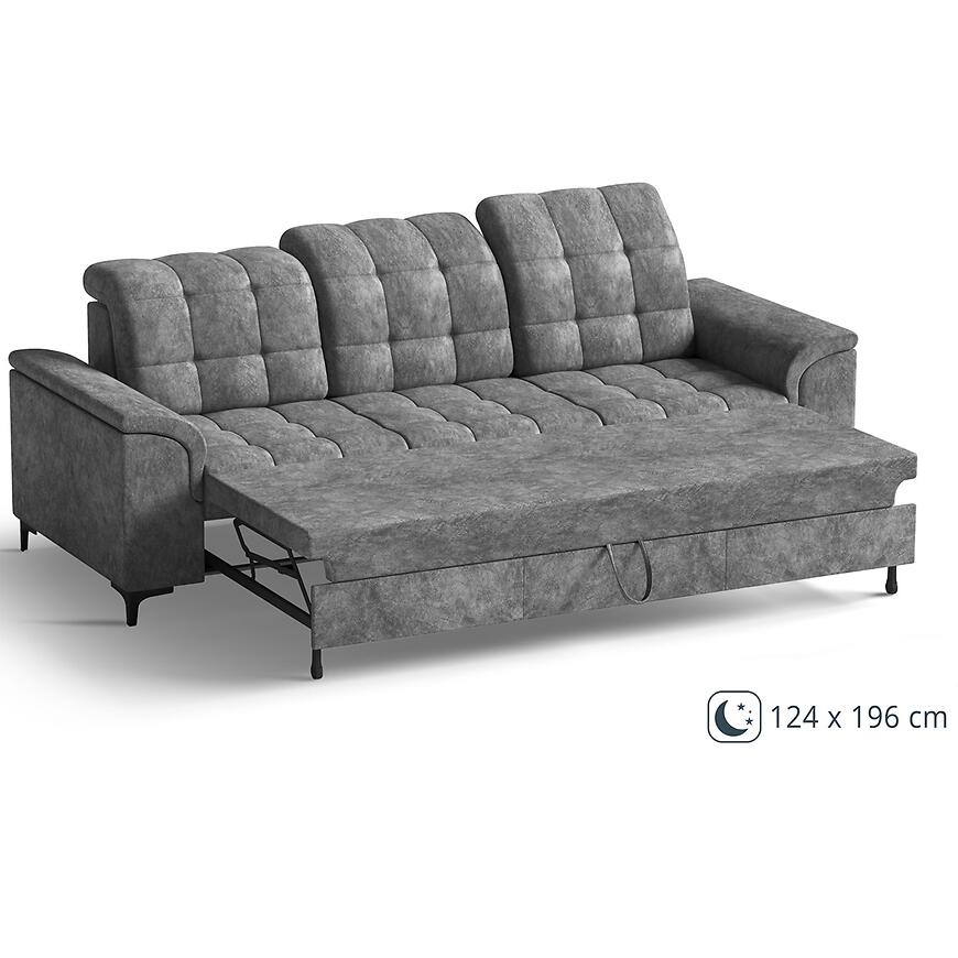 Komplet wypoczynkowy Snap 3+2+1 Bangkok Fog to eleganckie połączenie wygody i funkcjonalności. W zestawie znajduje się przestronna sofa z funkcją spania o powierzchni 196x124 cm, mniejsza sofa oraz komfortowy fotel. Całość pokryta jest trwałą tkaniną w odcieniu szarym, która doskonale komponuje się z różnymi aranżacjami. Komfort codziennego użytkowania zapewnia wypełnienie na sprężynie falistej oraz regulowane zagłówki. Zestaw wyposażono także w praktyczny schowek na pościel, stabilne czarne nogi oraz prosty mechanizm rozkładania delfin, dzięki czemu komplet łączy nowoczesny wygląd, wygodę i praktyczne zastosowanie.