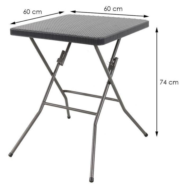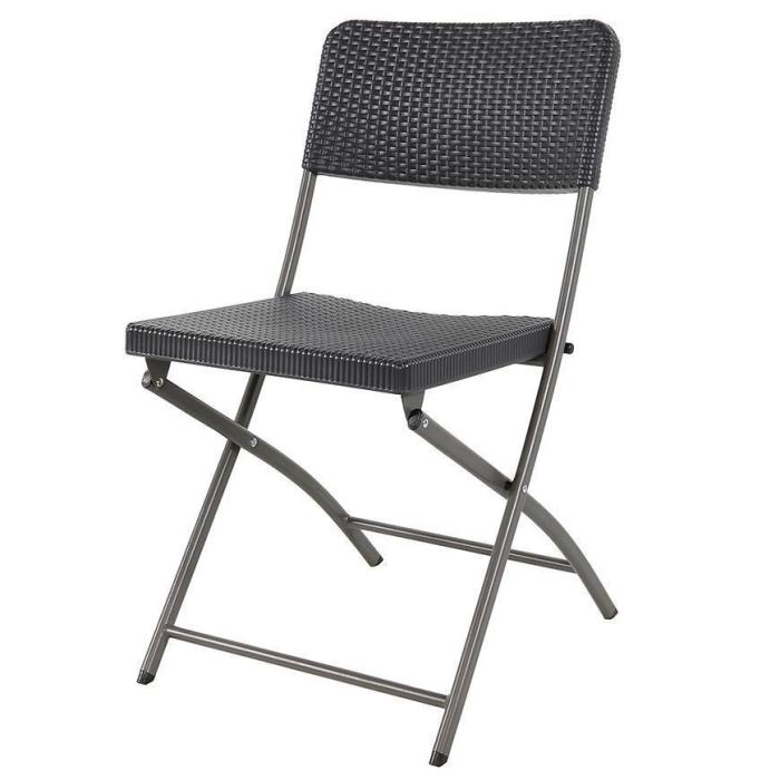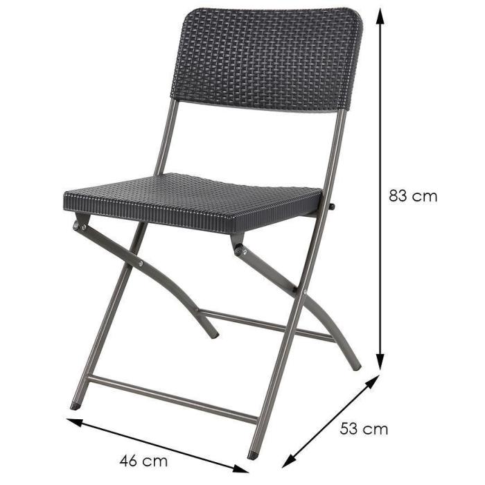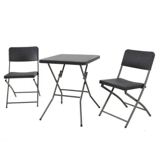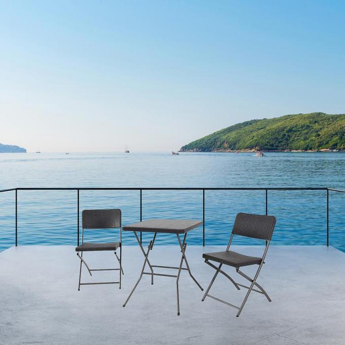 Dodatkowy efekt wizualny nadaje wzór technorattanu. Rama stolika i krzeseł jest metalowa. Nóżki posiadają antypoślizgowe nakładki. Krzesło jest składane dzięki czemu zajmuje niewiele miejsca.
