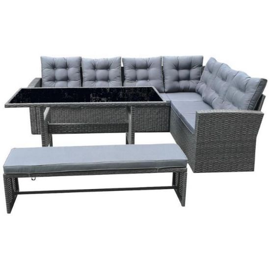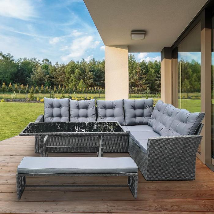Komplet mebli technorattanowych to idealne rozwiązanie do każdego ogrodu czy na taras gdzie z przyjemnością spędzisz wszystkie letnie popołudnia i weekendy wraz ze znajomymi czy rodziną. Blat stolika jest wytrzymały, wykonany bowiem ze szkła hartowanego, konstrukcja z kolei jest metalowa.