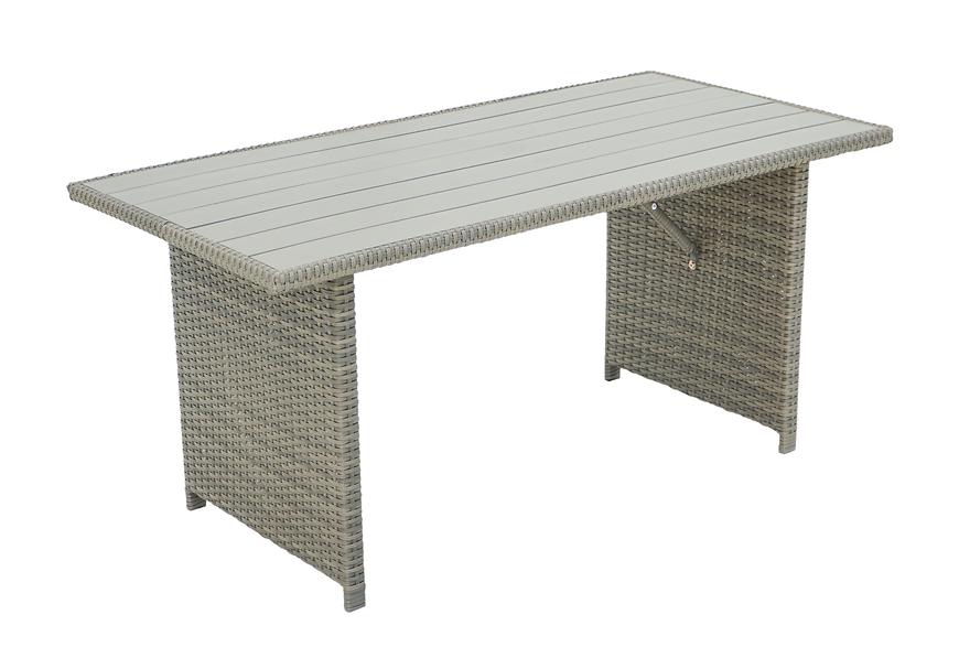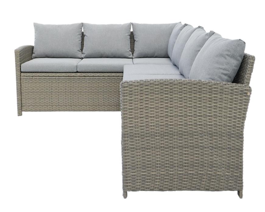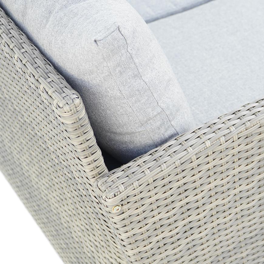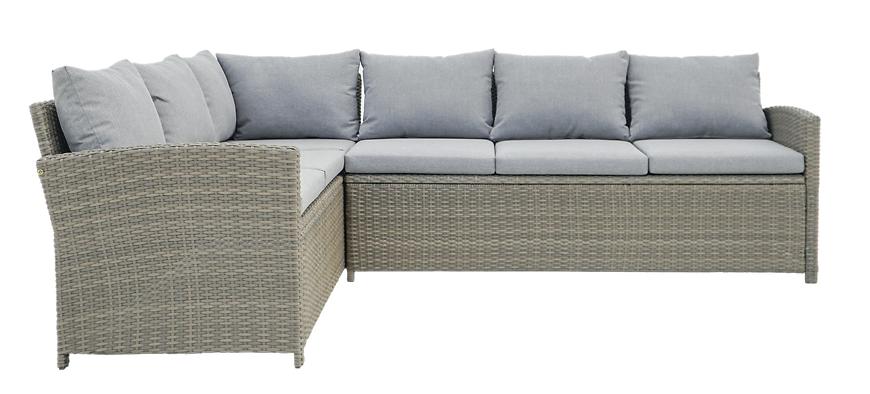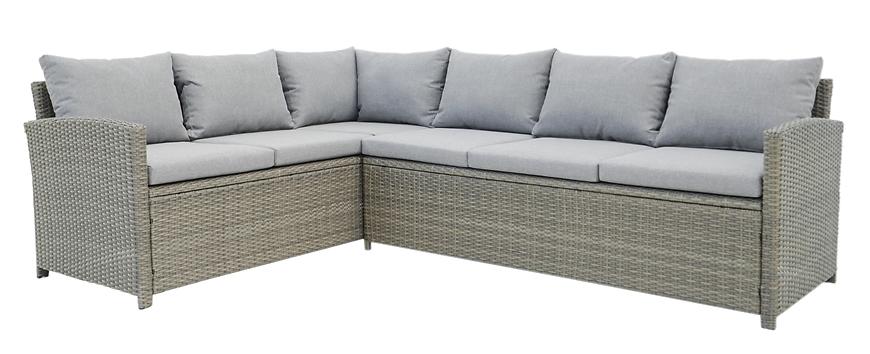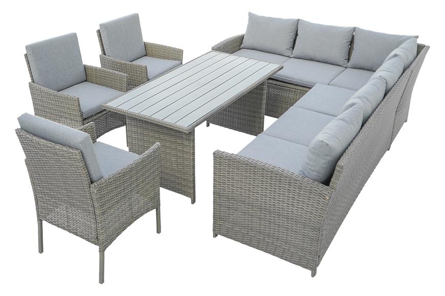 Zestaw składa się z dwóch przestronnych kanap, trzech foteli oraz stołu z blatem wykonanym z trwałego materiału polywood, który imituje naturalne drewno, a jednocześnie jest odporny na wilgoć i słońce.