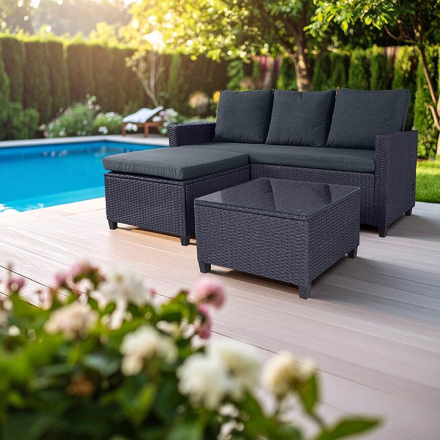 Czarny kolor zestawu Skipper nadaje mu nowoczesnego charakteru i łatwo komponuje się z innymi elementami ogrodowej aranżacji. Grafitowe poduszki podnoszą komfort siedzenia i wprowadzają subtelną kontrastową elegancję. Kompaktowe wymiary zestawu sprawiają, że idealnie sprawdzi się zarówno w przestronnych ogrodach, jak i na mniejszych balkonach czy tarasach.