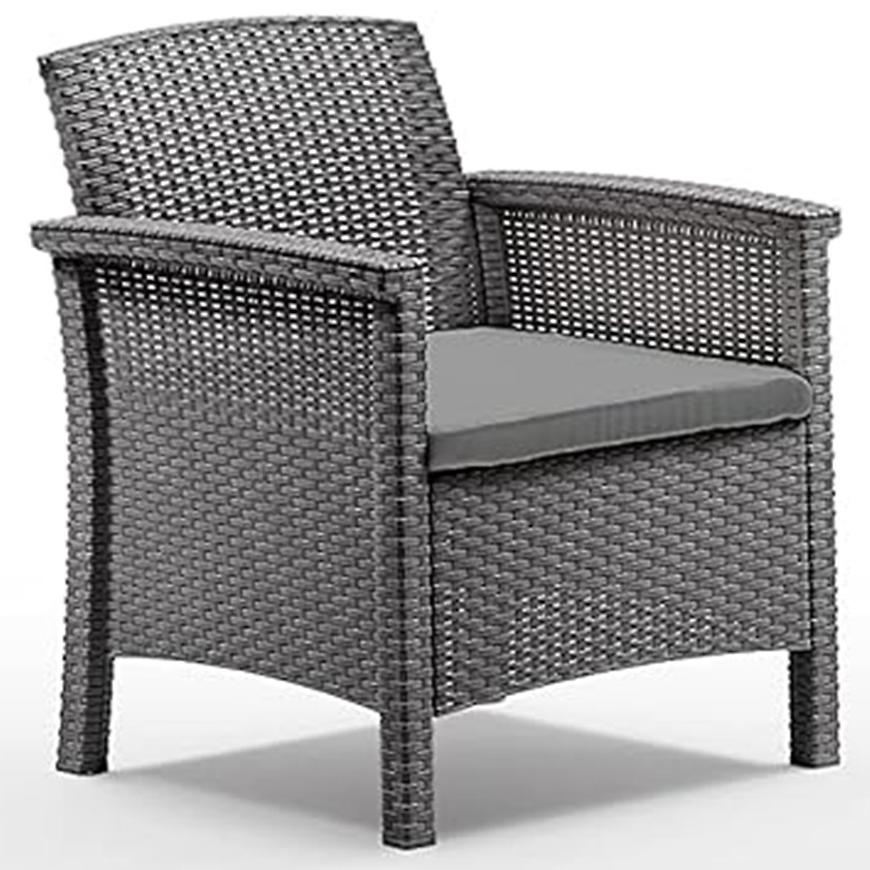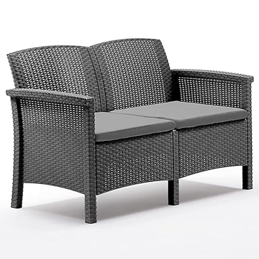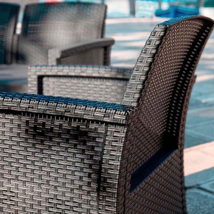 Fotele i kanapa o wymiarach 118 x 65 x 76 cm wykonane są z wysokiej jakości tworzywa sztucznego, które imituje naturalny rattan. Dzięki temu meble prezentują się niezwykle stylowo, jednocześnie będąc odporne na warunki atmosferyczne oraz łatwe w utrzymaniu czystości. Kolor grafitowy dodaje im nowoczesnego charakteru i doskonale komponuje się z różnorodnymi aranżacjami tarasu czy ogrodu.