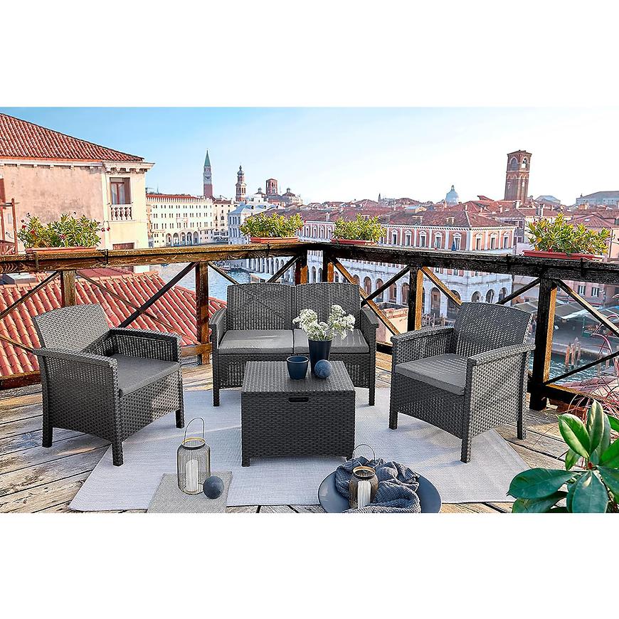 Komplet Venezia 2 Graphite to doskonały wybór dla tych, którzy pragną stworzyć elegancką i wygodną strefę relaksu na swoim tarasie lub w ogrodzie. Składający się z dwóch foteli, kanapy oraz stolika kawowego, zestaw ten zapewni nie tylko wygodę, ale także stylową aranżację przestrzeni zewnętrznej.