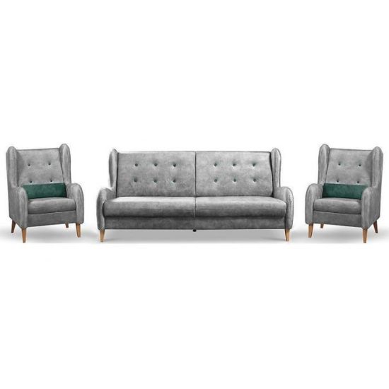 W skład zestawu Lahti wchodzi wersalka oraz dwa fotele. Meble wykonane zostały z eleganckiej, szarym tkaniny. Wersalka wzbogacona została o automat wersalkowy ułatwiający jej rozkładanie oraz pojemnik na pościel, a duża powierzchnia do spania - 125x195 cm pomieści co najmniej dwie osoby i jest doskonałym rozwiązaniem w przypadku niezapowiedzianych odwiedzin. Jej siedzisko i oparcie wypełniono sprężyną falistą oraz pianką, design wzbogacono za pomocą ozdobnych guzików. Z pewnością wkomponuje się w eleganckie wnętrze, nadając mu luksusowego charakteru i designerskiego wyglądu.