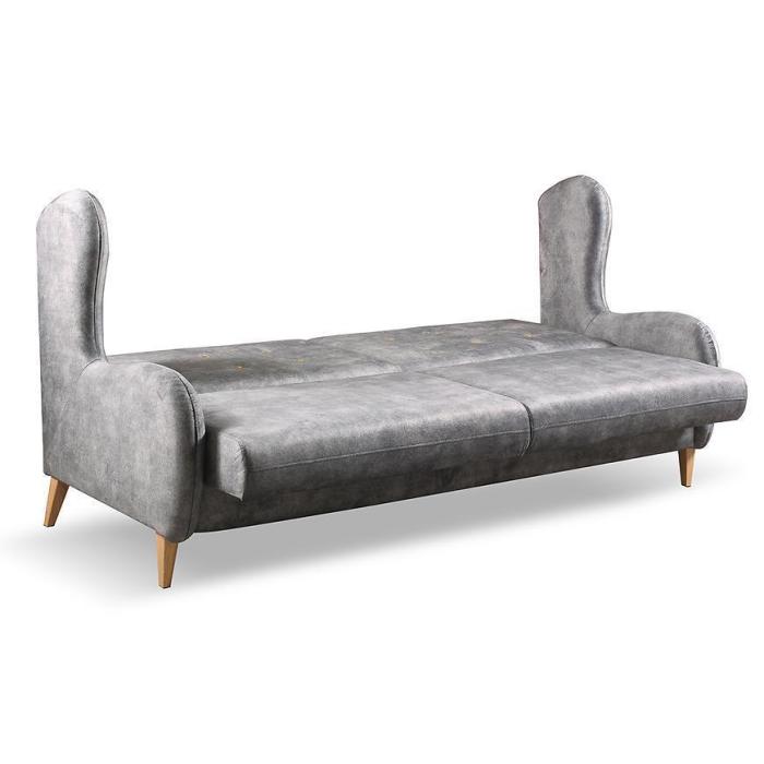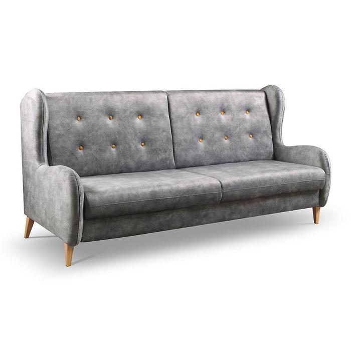 W skład zestawu Lahti wchodzi wersalka oraz dwa fotele. Meble wykonane zostały z eleganckiej, szarym tkaniny. Wersalka wzbogacona została o automat wersalkowy ułatwiający jej rozkładanie oraz pojemnik na pościel, a duża powierzchnia do spania - 125x195 cm pomieści co najmniej dwie osoby i jest doskonałym rozwiązaniem w przypadku niezapowiedzianych odwiedzin. Jej siedzisko i oparcie wypełniono sprężyną falistą oraz pianką, design wzbogacono za pomocą ozdobnych guzików. Z pewnością wkomponuje się w eleganckie wnętrze, nadając mu luksusowego charakteru i designerskiego wyglądu.