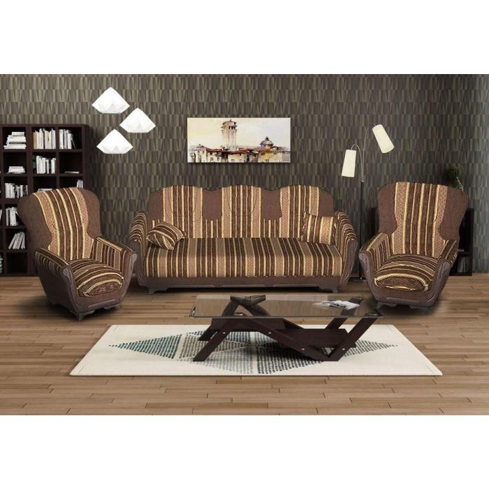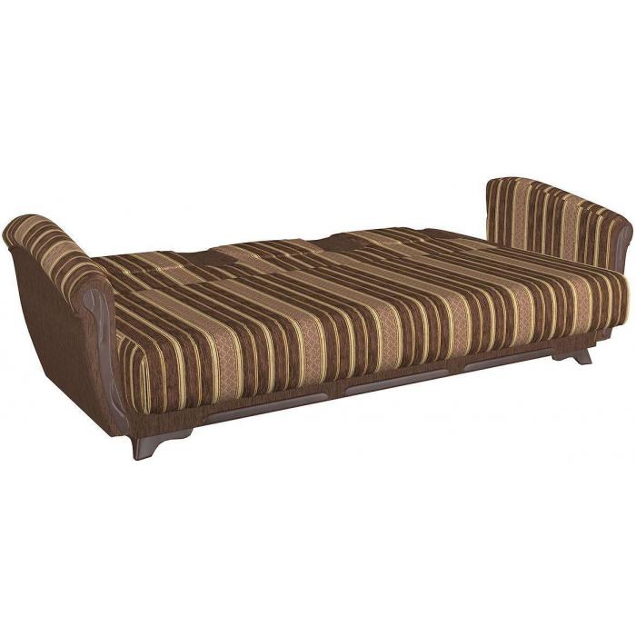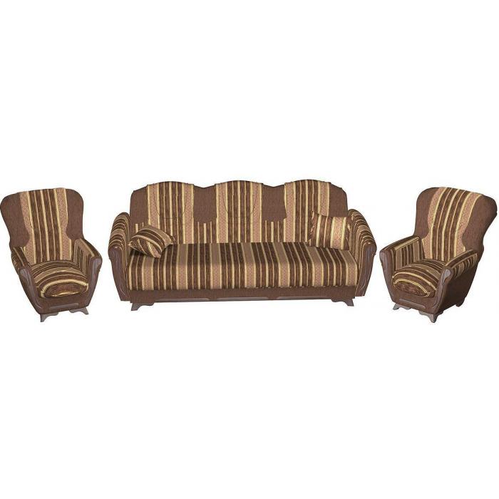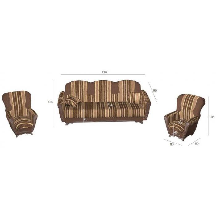 Klasyczny i wytworny zestaw mebli wypoczynkowych, który doda każdemu wnętrzu szyku i elegancji. Stylowe drewniane wykończenia idealnie komponują się z wysokogatunkowymi materiałami. W skład zestawu wchodzi komfortowa kanapa z funkcją spania i pojemnikiem na pościel oraz dwa wygodne fotele.
