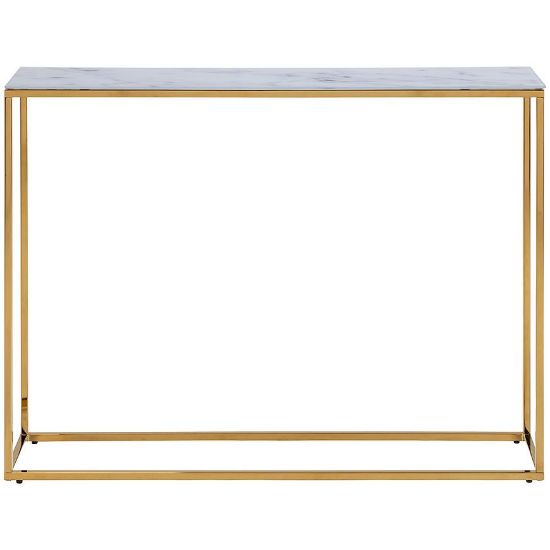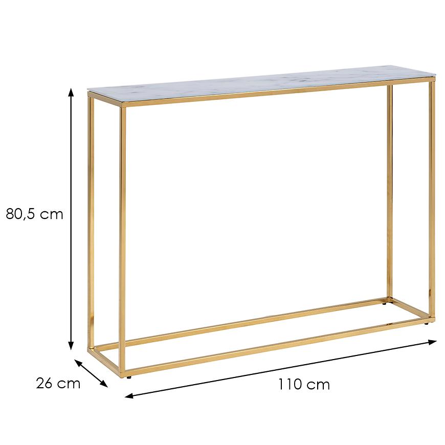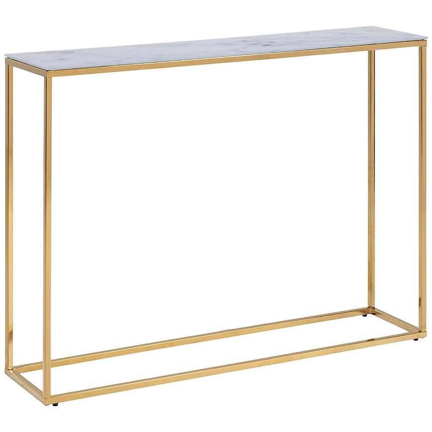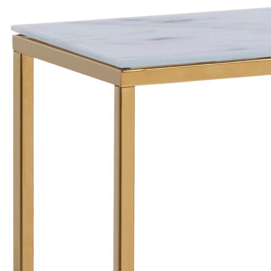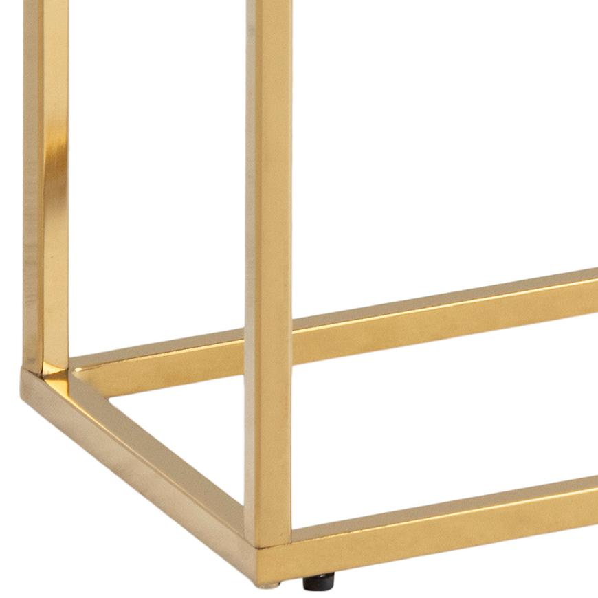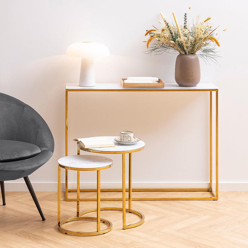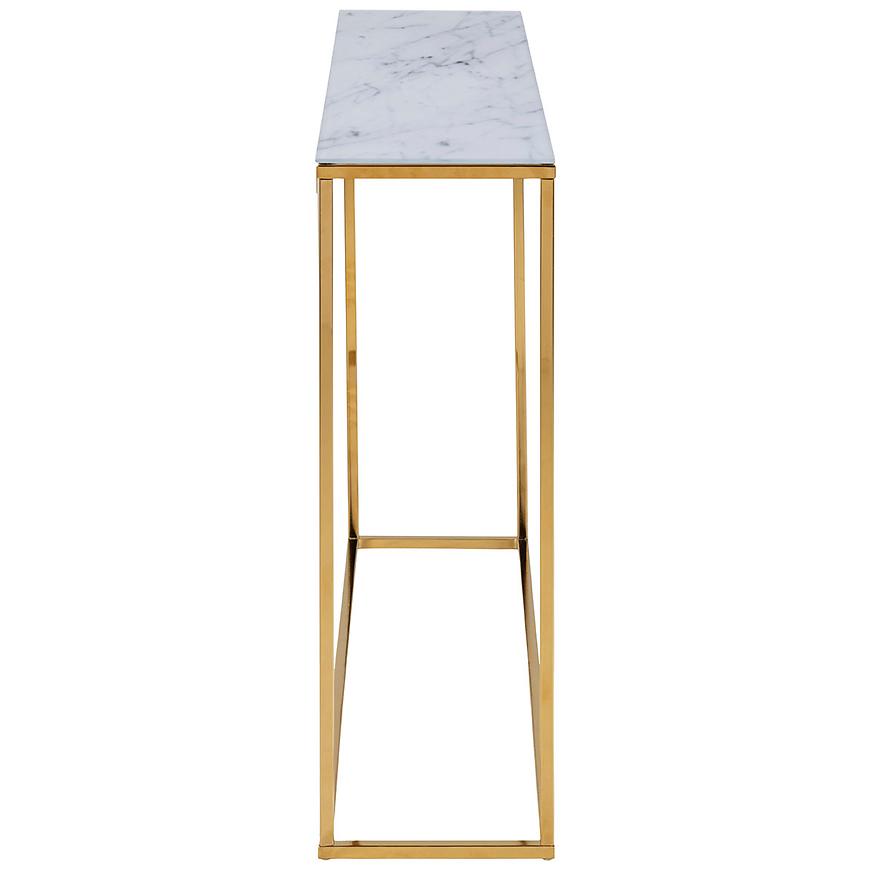 Półka konsoli wykonana jest z białego marmuru, co nadaje całości wyrafinowanego charakteru. Marmurowe wybarwienie doskonale kontrastuje z złotym korpusem, tworząc harmonijną kompozycję kolorystyczną.