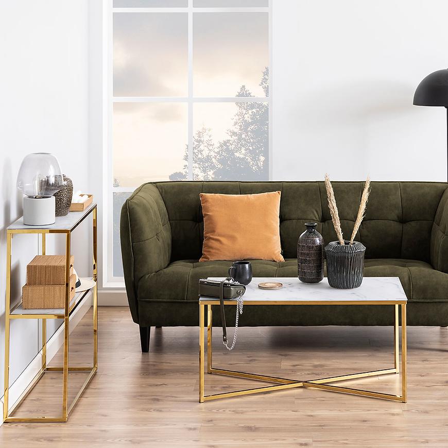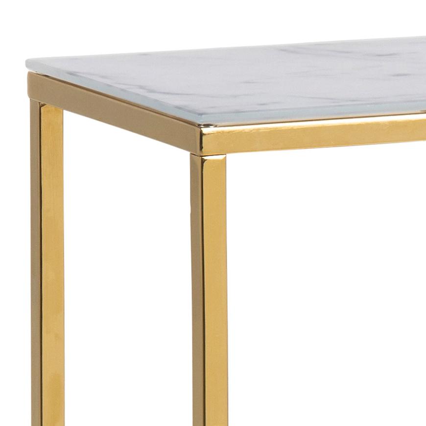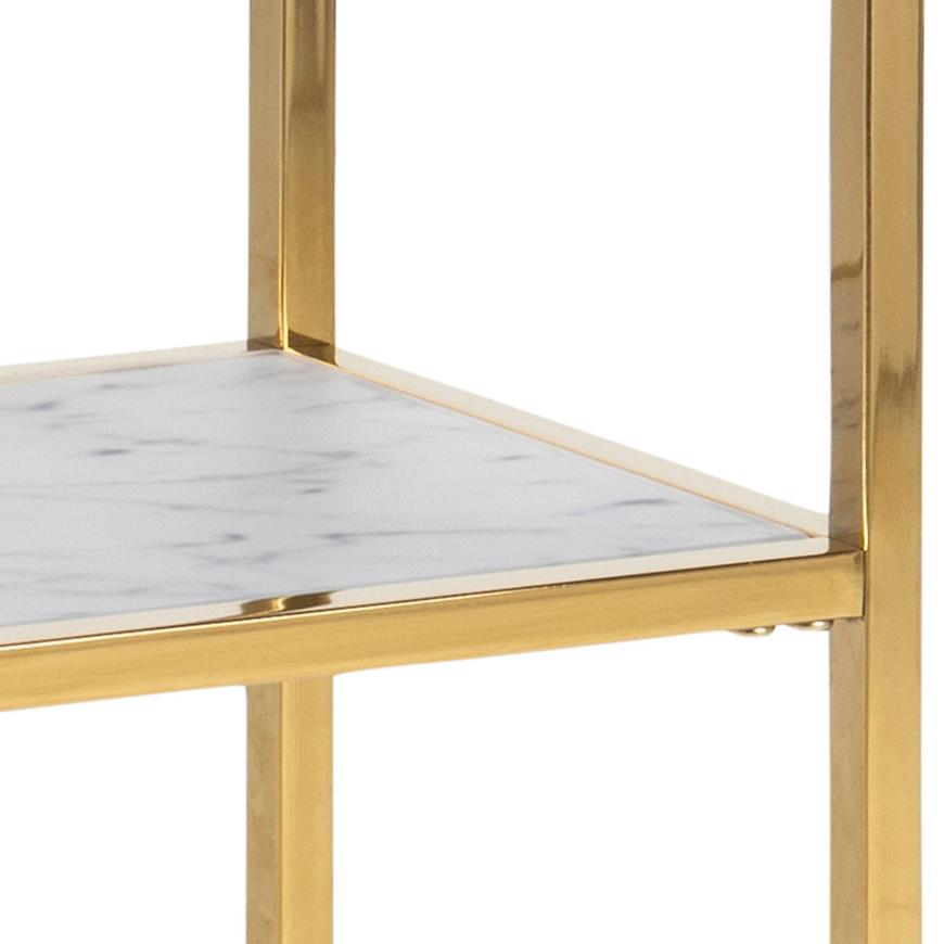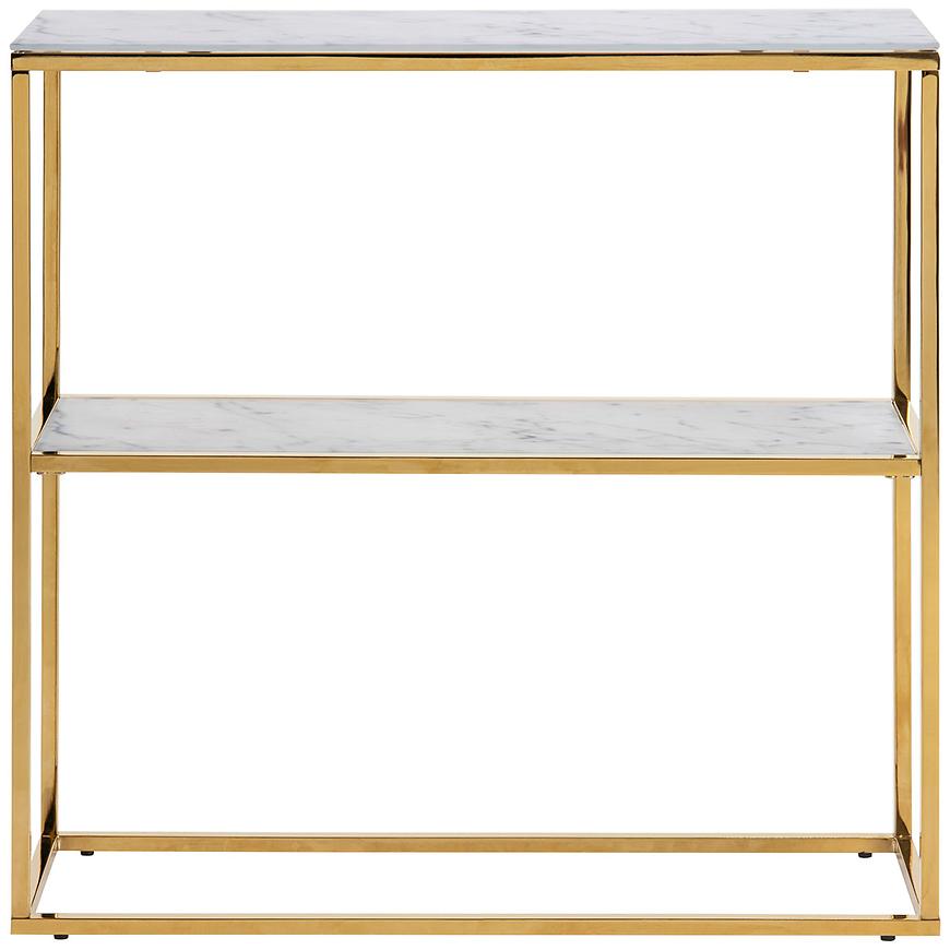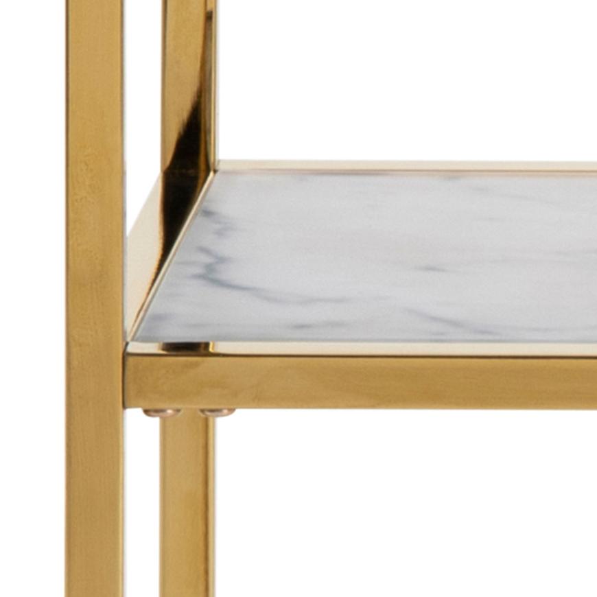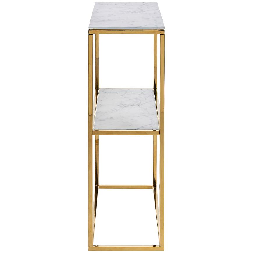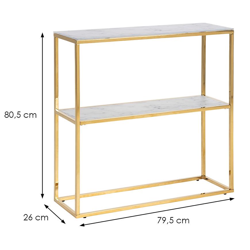 Półki konsoli wykonane są z białego marmuru, co nadaje całości wyrafinowanego charakteru. Marmurowe wybarwienie półek doskonale kontrastuje z złotym korpusem, tworząc harmonijną kompozycję kolorystyczną.