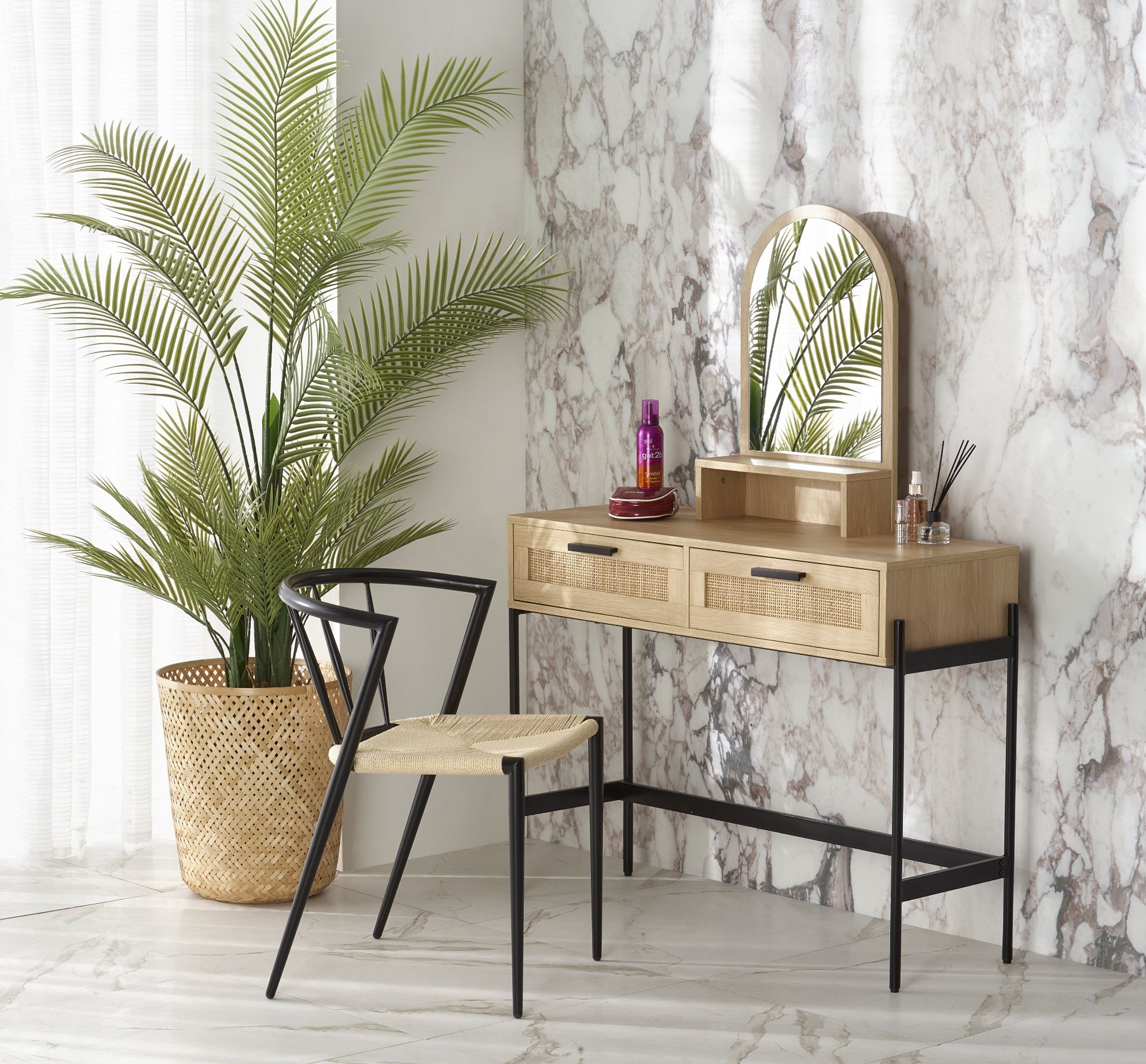Konsolka/Toaletka Karmella to nie tylko praktyczne miejsce do pielęgnacji, ale także elegancki element dekoracyjny. Kombinacja materiałów, tj. płyta meblowa, rattan i stal, tworzy spójne połączenie stylu naturalnego i nowoczesnego. Współczesna elegancja i funkcjonalność idą tu w parze, tworząc miejsce, które zachęca do relaksu i dbania o siebie.