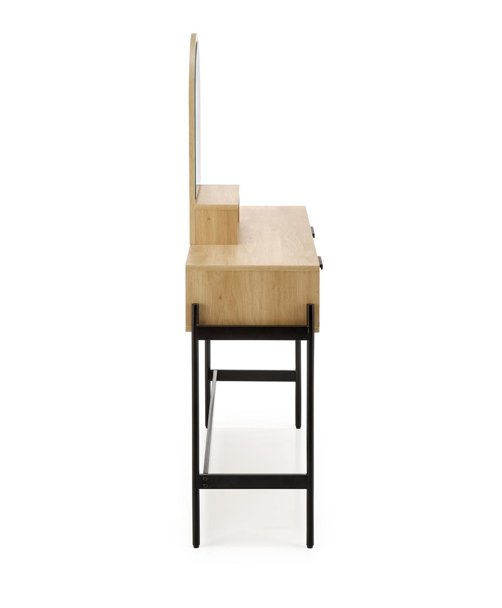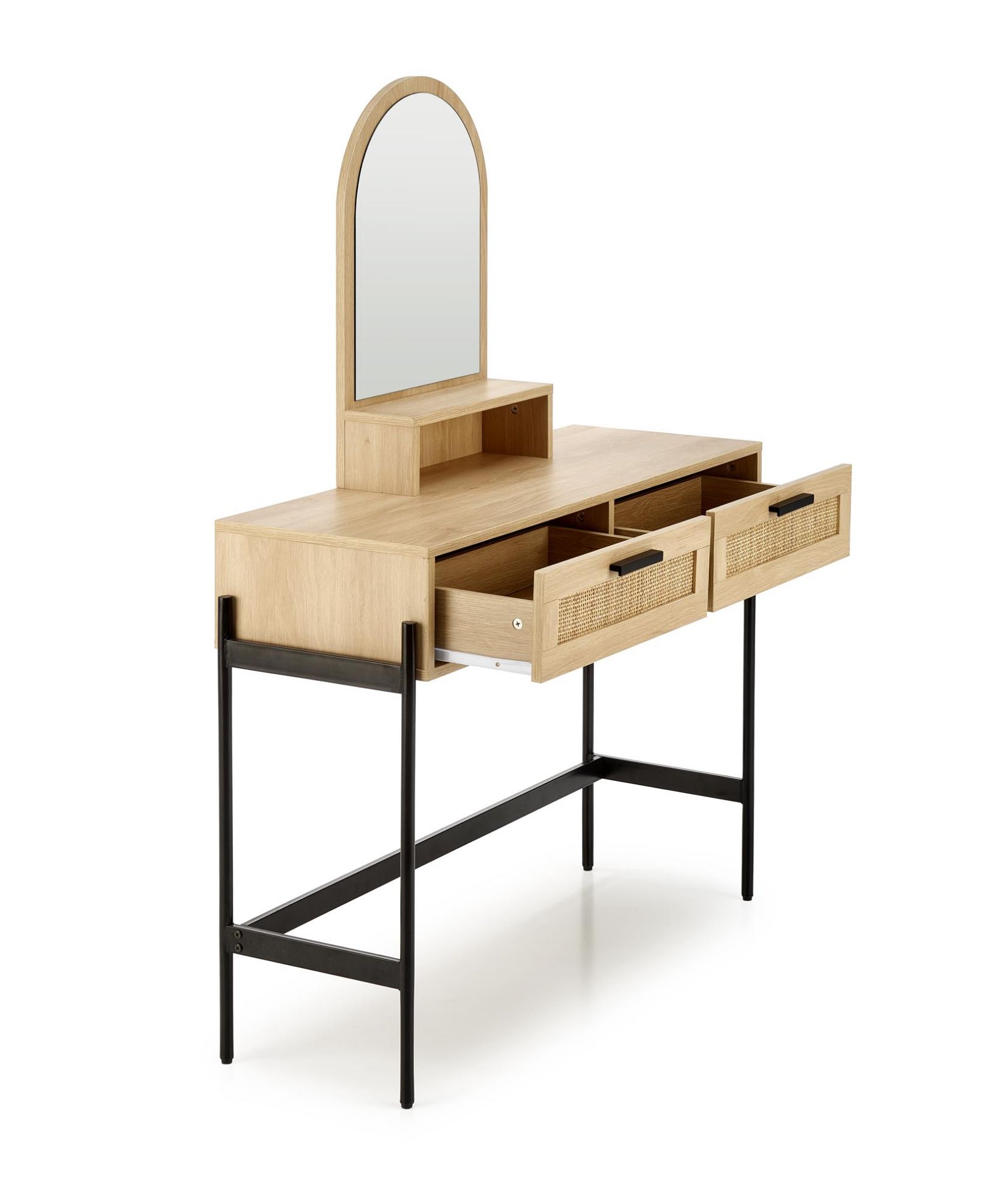 Stal malowana proszkowo w kolorze czarnym została zastosowana do stelaża toaletki, nadając jej solidnej konstrukcji i nowoczesnego wyglądu. Toaletka Karmella została wyposażona w dwie praktyczne szuflady, umożliwiające porządkowanie kosmetyków czy drobnych przedmiotów, a także w półkę i lustro, co dodatkowo zwiększa jej funkcjonalność.