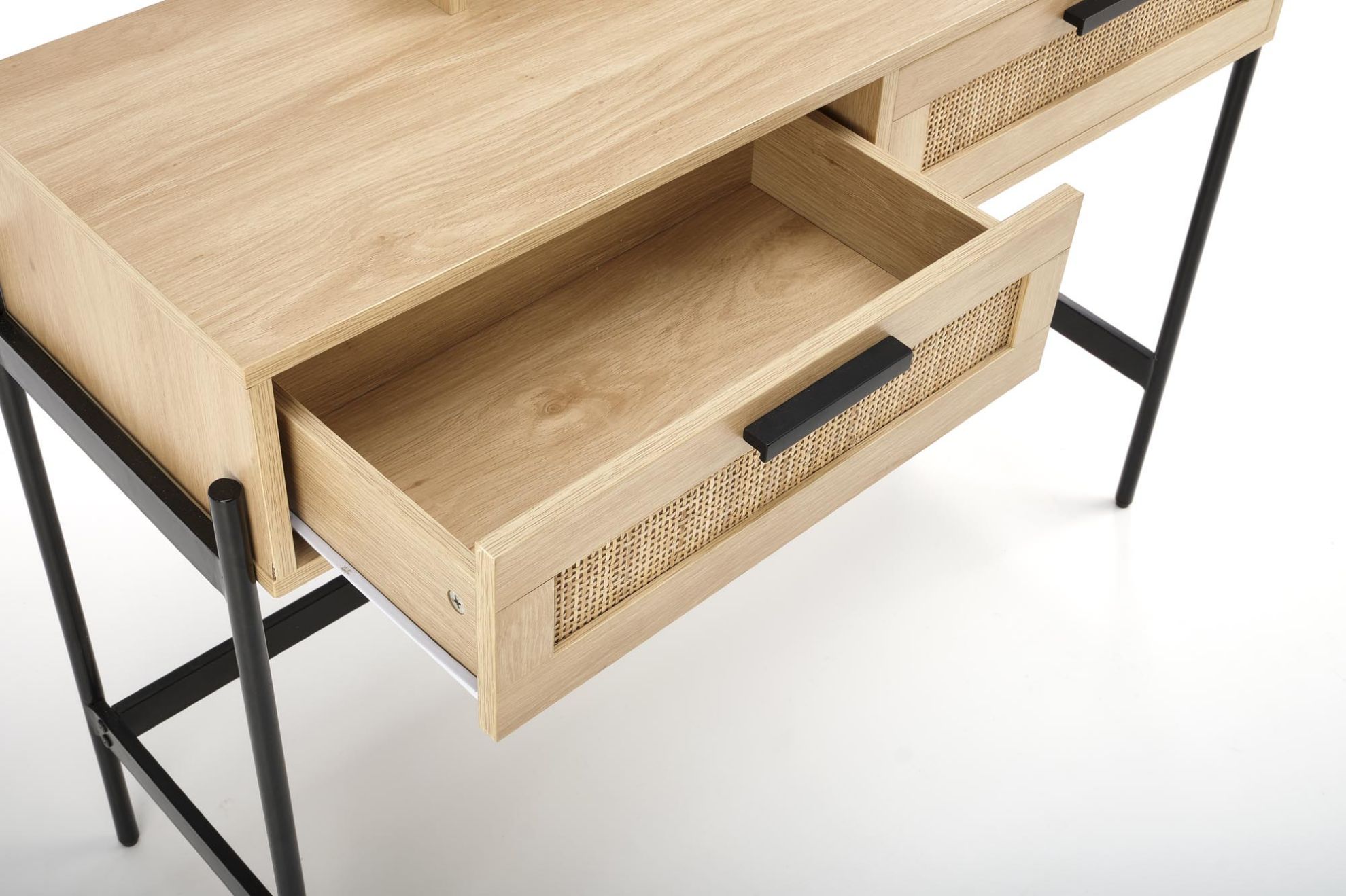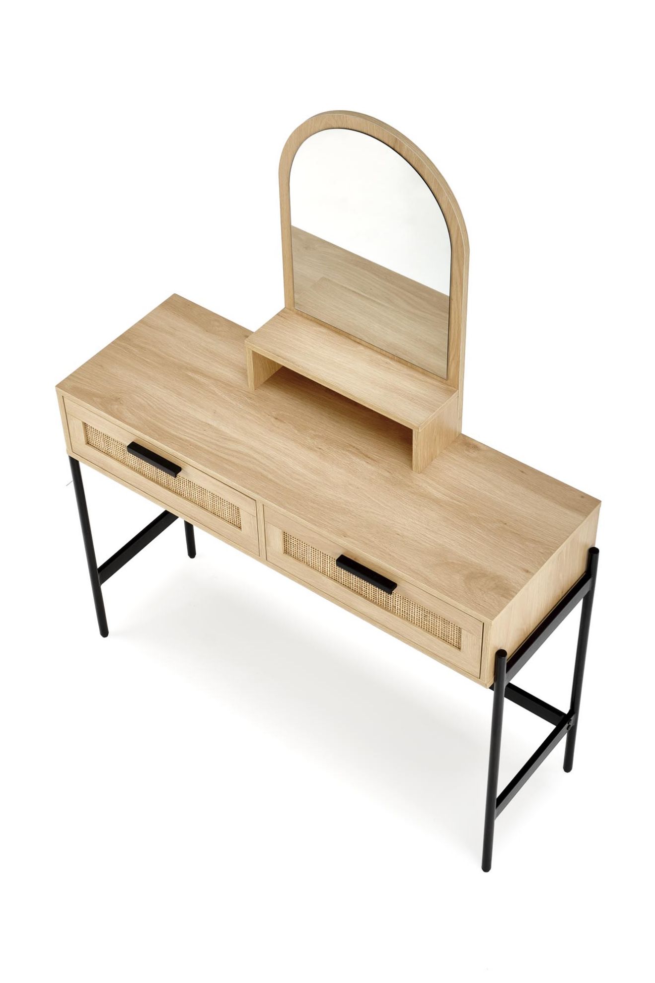 Blat toaletki wykonany jest z trwałej płyty meblowej okleinowanej melaminą, co zapewnia łatwą pielęgnację i długotrwałe użytkowanie. Dodatkowo, ozdobne wykończenie z rattanu naturalnego nadaje meblowi subtelnego, boho-charakteru, przyciągając uwagę elegancją i delikatnością.