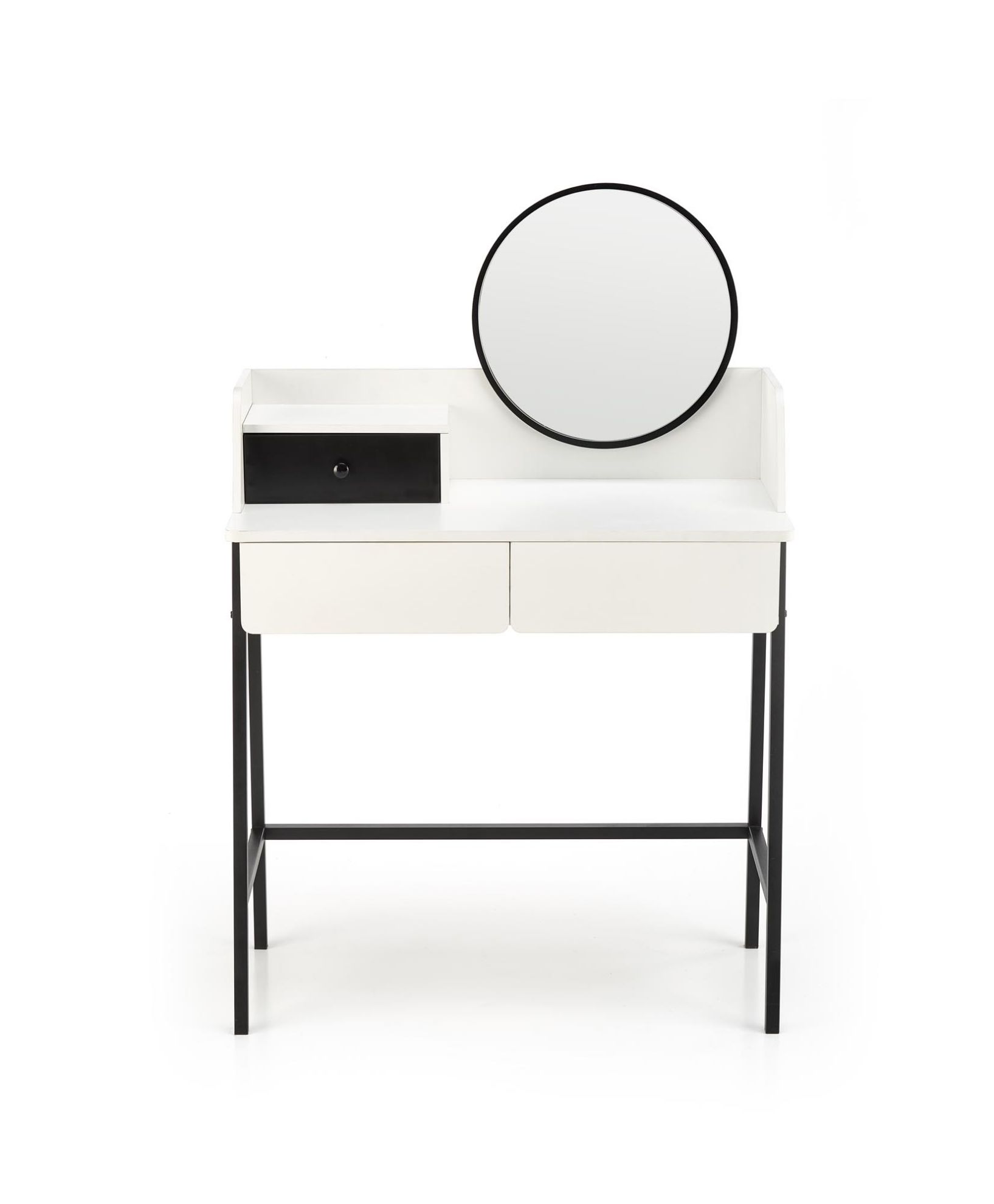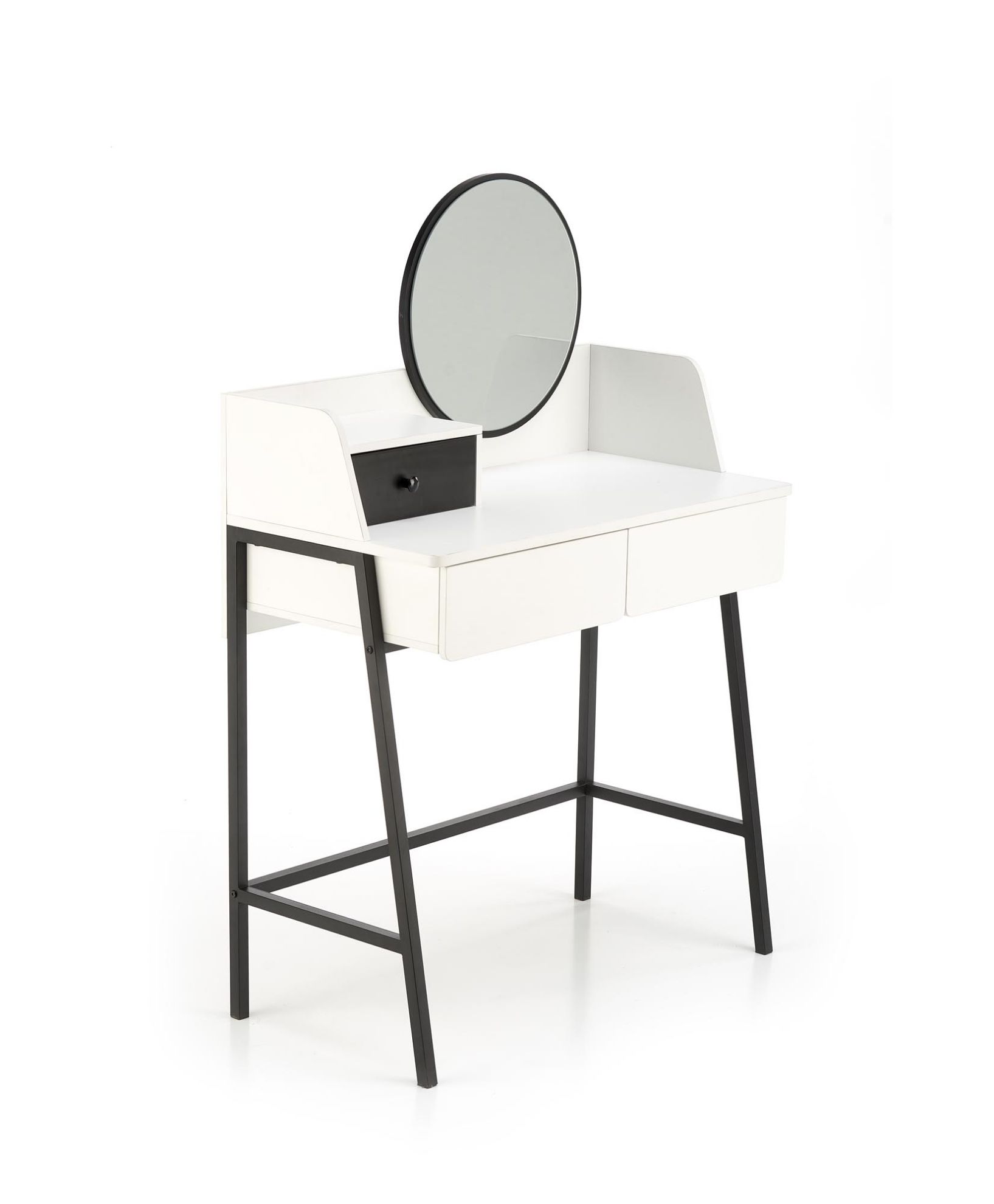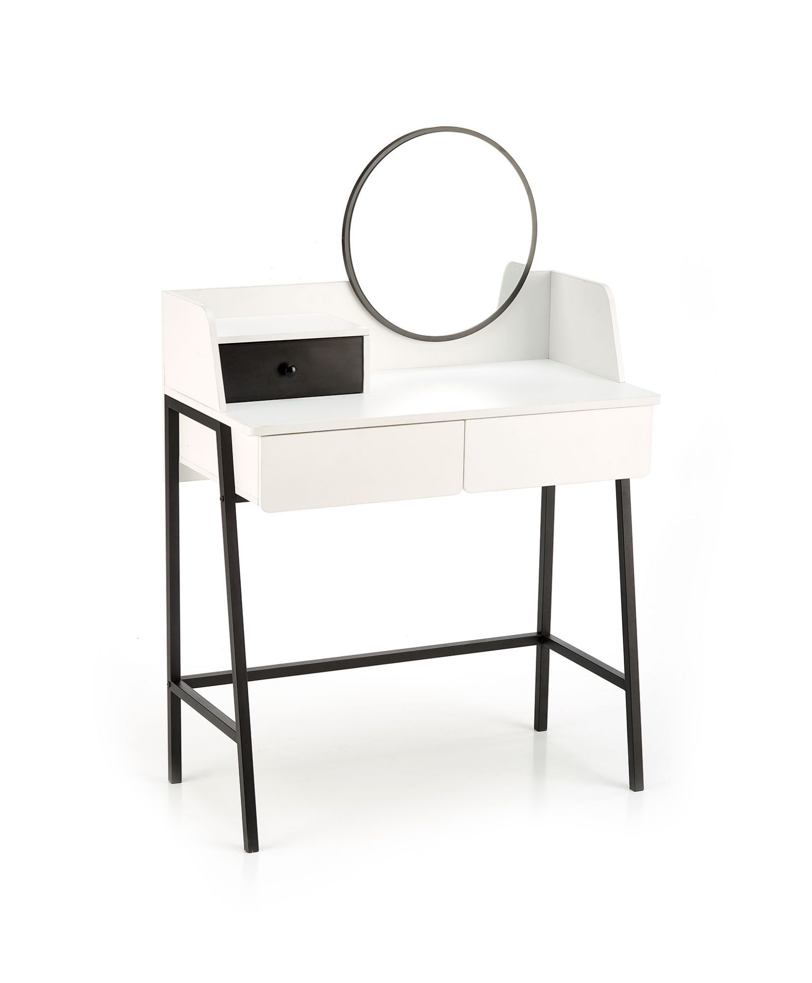 Stalowy stelaż malowany proszkowo, stanowi solidne podparcie dla toaletki, dodając jednocześnie nowoczesnego akcentu. Trzy praktyczne szuflady umożliwiają uporządkowanie kosmetyków, biżuterii czy innych niezbędnych akcesoriów. Dzięki nim, wszystko jest zawsze pod ręką, a przestrzeń pozostaje schludna i zorganizowana.