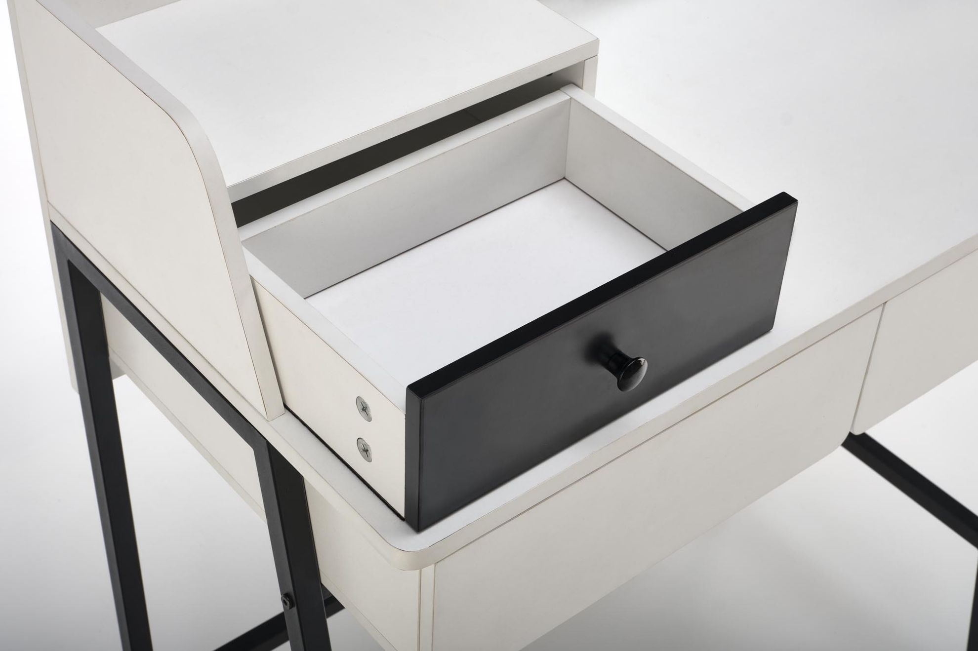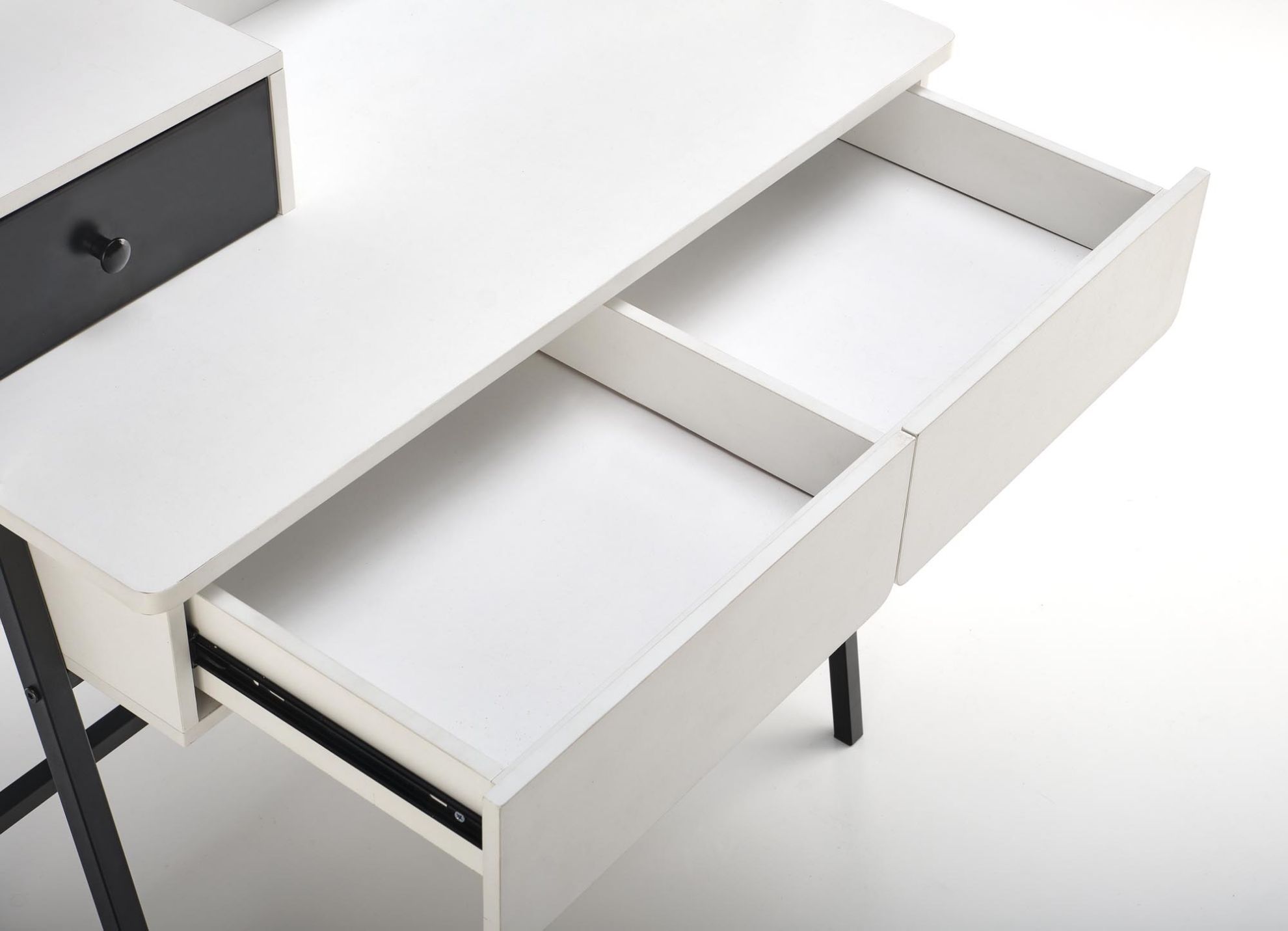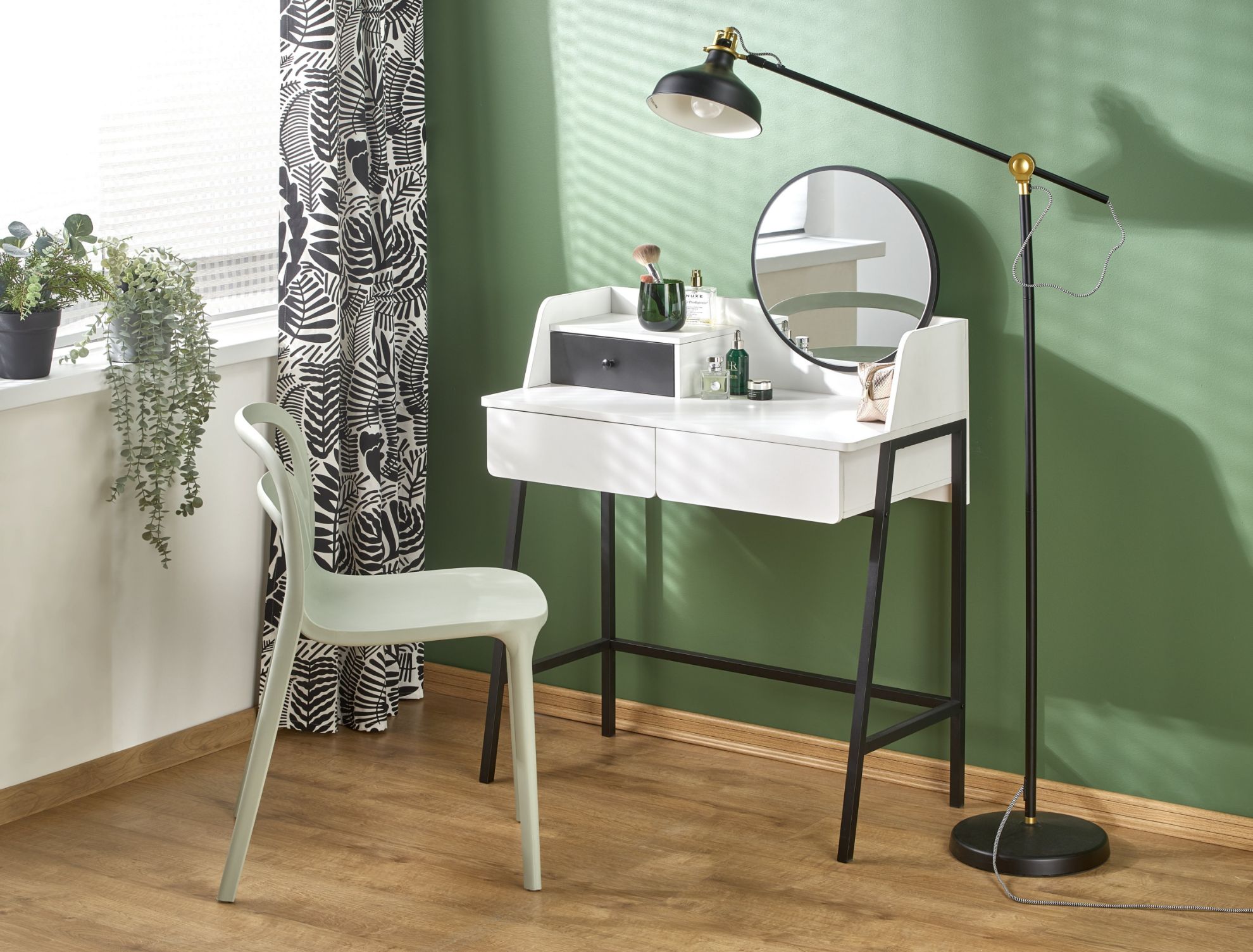 Stalowy stelaż malowany proszkowo, stanowi solidne podparcie dla toaletki, dodając jednocześnie nowoczesnego akcentu. Trzy praktyczne szuflady umożliwiają uporządkowanie kosmetyków, biżuterii czy innych niezbędnych akcesoriów. Dzięki nim, wszystko jest zawsze pod ręką, a przestrzeń pozostaje schludna i zorganizowana.
