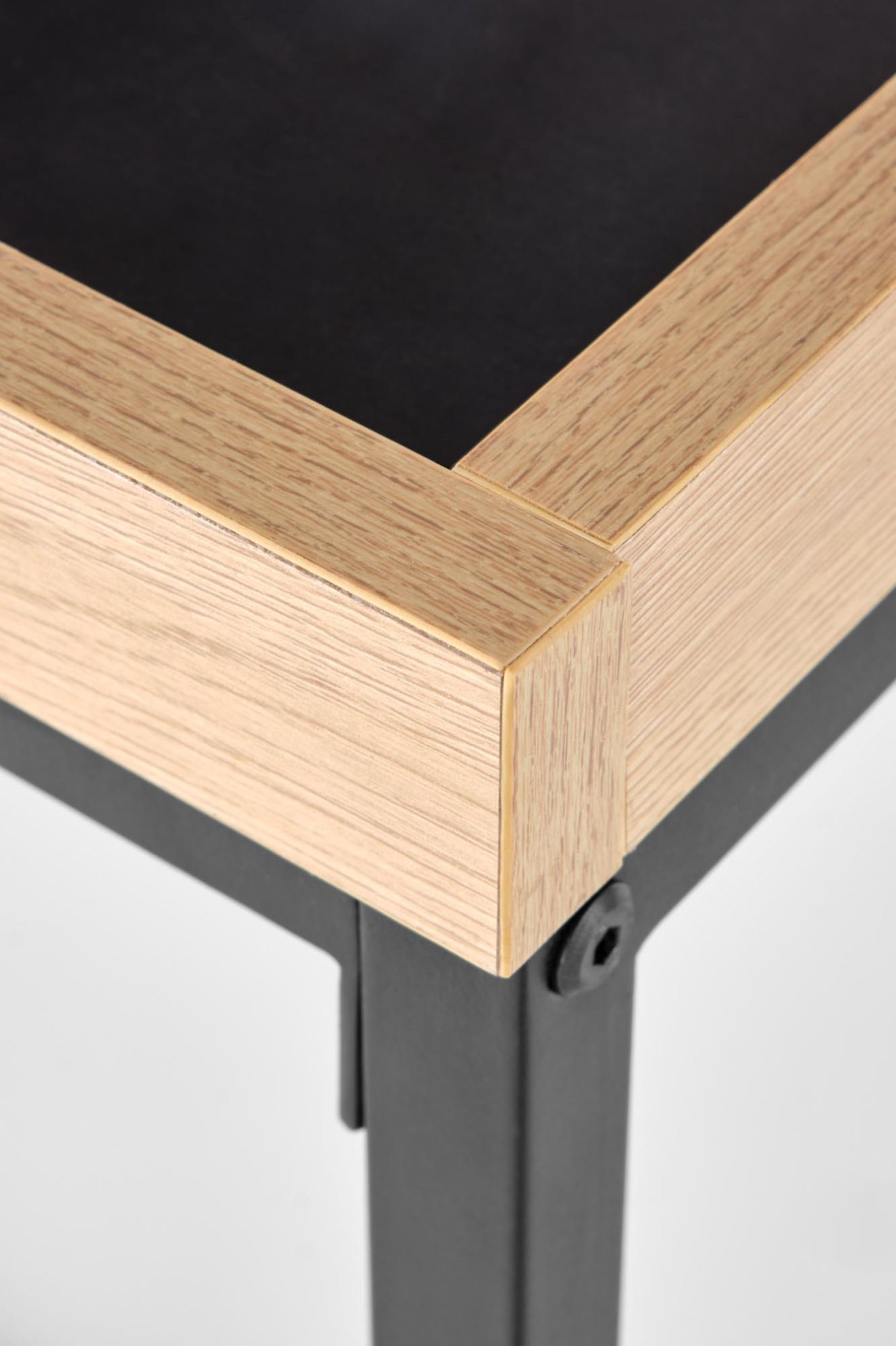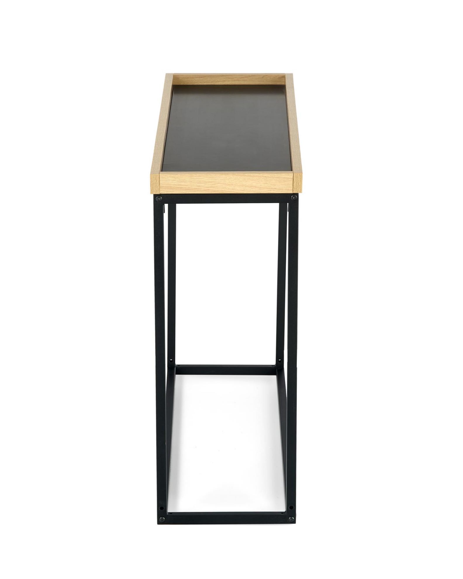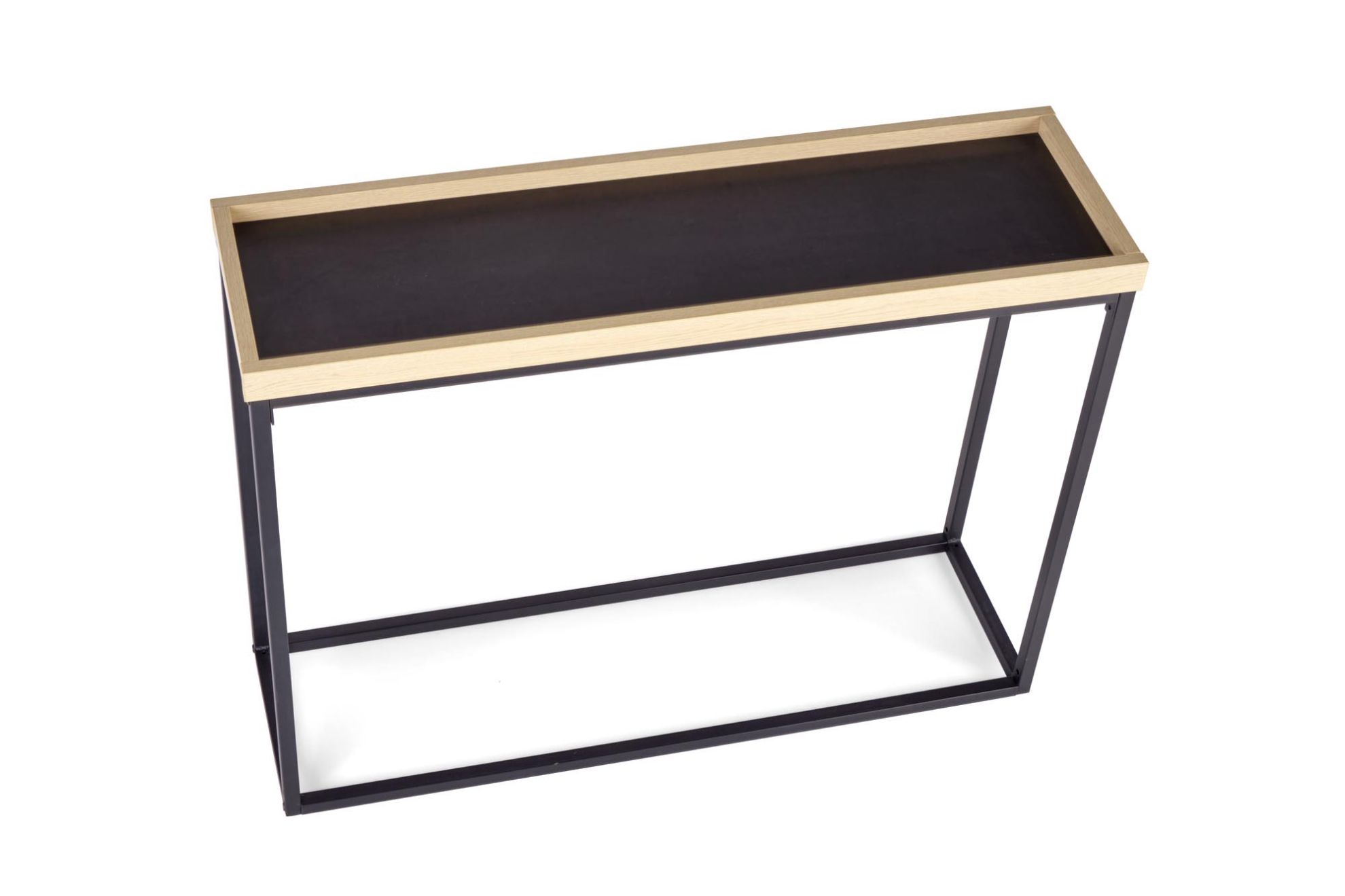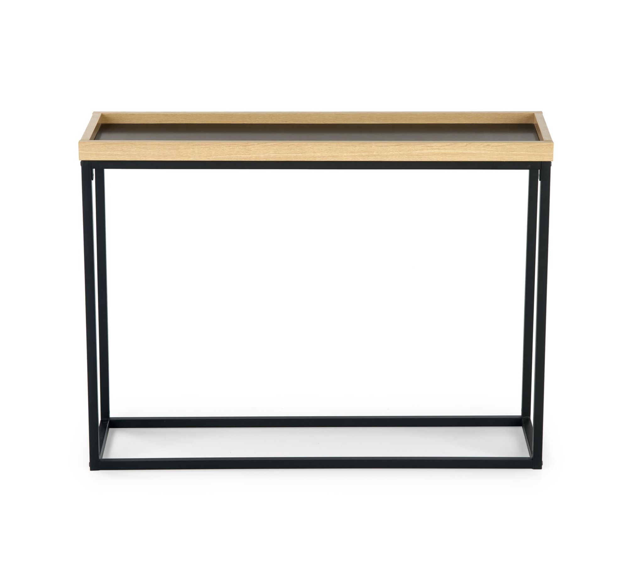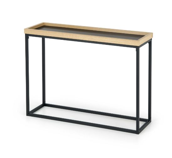 Blat konsolki wykonany został z trwałej płyty meblowej okleinowanej melaminą, co zapewnia nie tylko estetyczny wygląd, ale także łatwość utrzymania w czystości. Kolor czarny nadaje meblowi nowoczesnego charakteru, podczas gdy naturalny odcień elementów stalowych dodaje mu subtelnej lekkości.