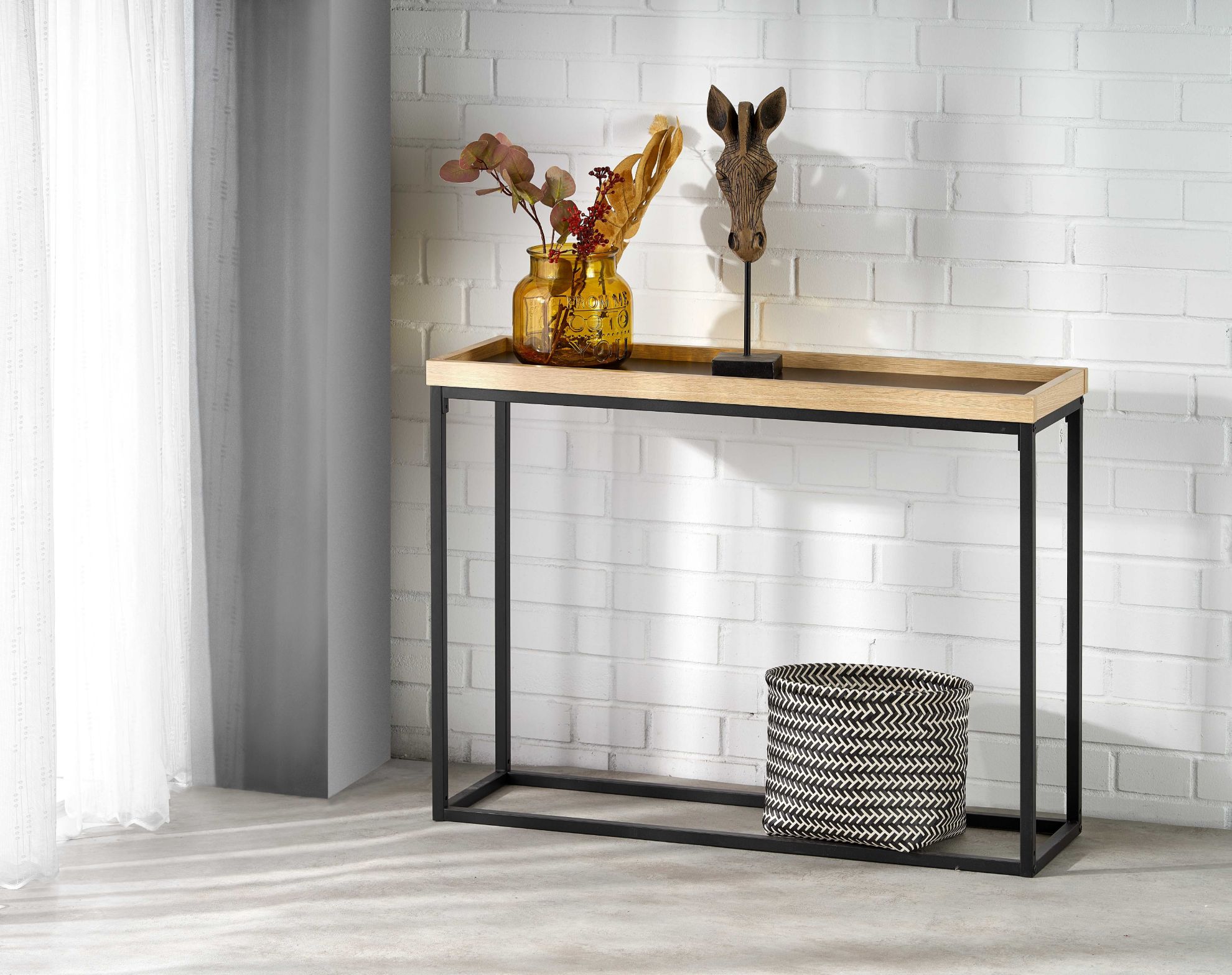 Stal malowana proszkowo, zastosowana w konstrukcji, gwarantuje trwałość i solidność. Konsolka Tahiti została zaprojektowana z myślą o praktycznym wykorzystaniu przestrzeni – idealnie sprawdzi się jako miejsce do umieszczania kluczy, ozdobnych przedmiotów czy dekoracyjnych dodatków.