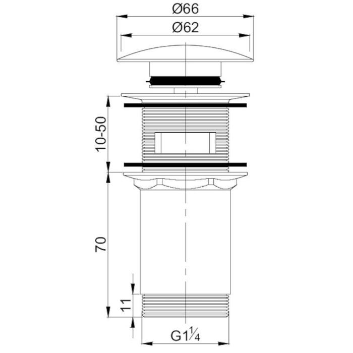 Korek Klik klak wykonany z metalu w kolorze chromu. Jego rozmiar (podłączenie) to 1 i 1/4 cala. Średnica wynosi 66 mm.
