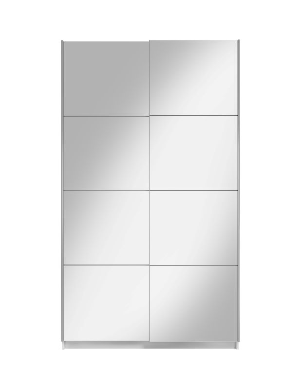 Korpus szafy wykonany w kolorze biały mat, fronty dostępne w kolorach: biały mat, biały mat z lustrem, pełne lustro, dąb wotan oraz dąb wotan z lustrem. Całość, korpus wraz z frontem, tworzą szafę dwudrzwiową Asti 120. To doskonała propozycja do sypialni, a także do przedpokoju. Szafa posiada drzwi przesuwne oraz uchwyty relingowe w kolorze srebrnym.