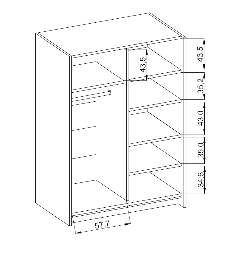 Jej wnętrze podzielone jest na dwie części, w każdej części znajduje się drążek na długie ubrania oraz półką. Mebel wykonano z płyty laminowanej. Do szafy można dokupić komplet trzech półek w kolorze biały mat jest to opcja dodatkowo płatna.