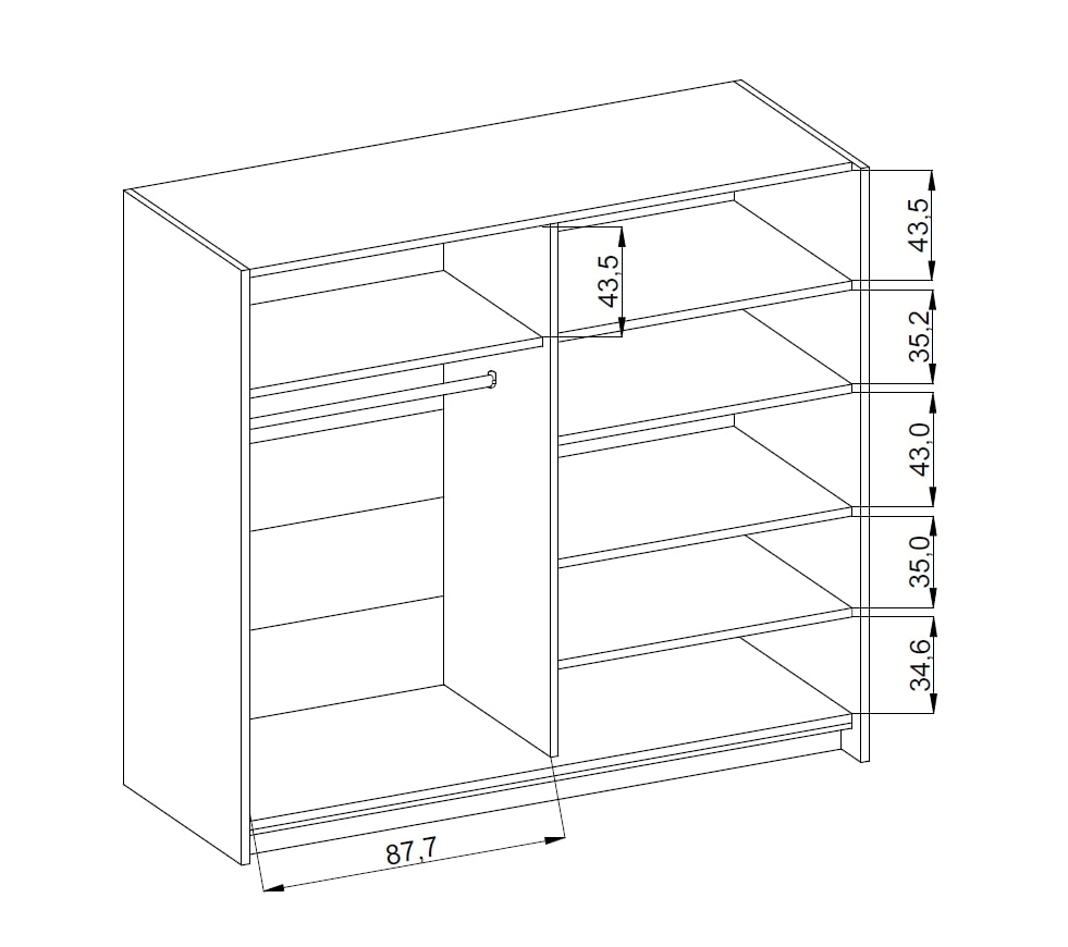 Jej wnętrze podzielone jest na dwie części, w każdej części znajduje się drążek na długie ubrania oraz półką. Mebel wykonano z płyty laminowanej. Do szafy można dokupić komplet trzech półek jest to opcja dodatkowo płatna.