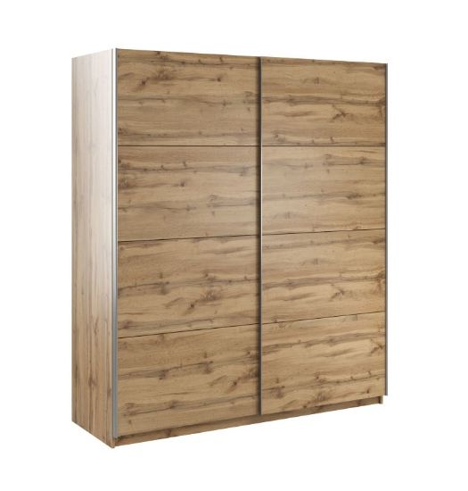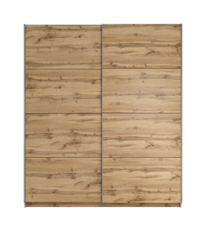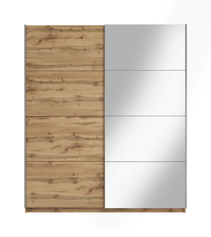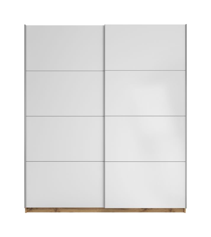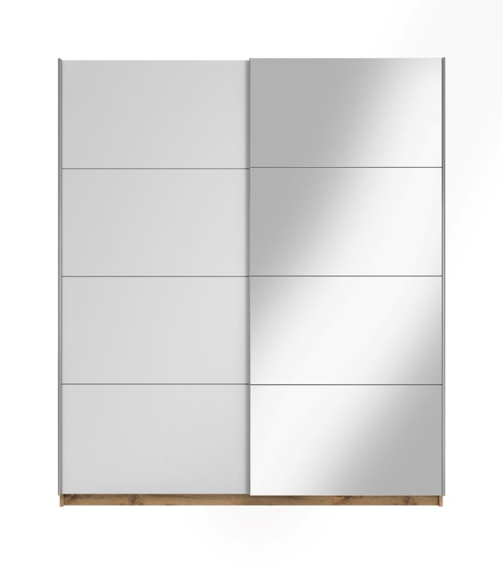 Szafa dwudrzwiowa Asti 180 to doskonała propozycja do sypialni, a także do przedpokoju. Korpus szafy wykonany jest w kolorze dąb wotan, fronty dostępne w kolorach: biały mat, biały mat z lustrem, dąb wotan, dąb wotan z lustrem. Całość w matowym wykończeniu. Szafa posiada drzwi przesuwne oraz uchwyty relingowe w kolorze srebrnym.