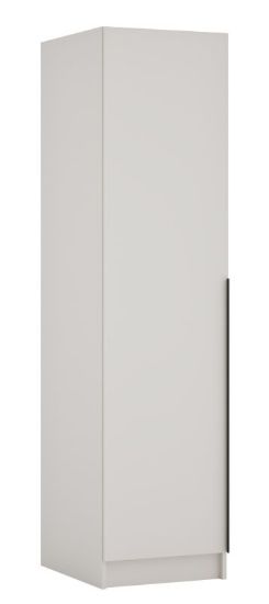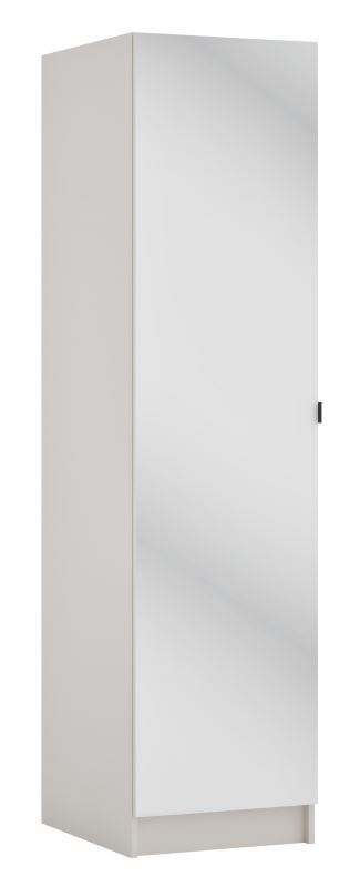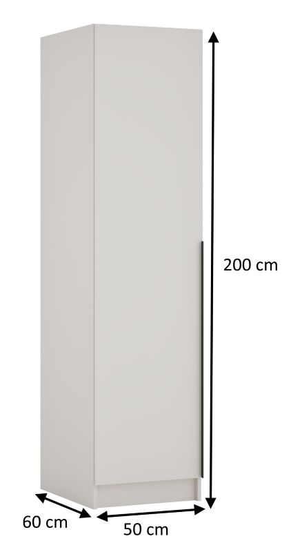 W kolekcji dostępne są moduły o szerokościach 50 cm, 100 cm oraz 150 cm, a także szafa narożna, która umożliwia praktyczne zagospodarowanie trudnych do ustawienia kątów. Standardowa wysokość 200 cm sprawdza się w typowych mieszkaniach, gdzie istotne jest zachowanie proporcji między meblem a wysokością pomieszczenia.
