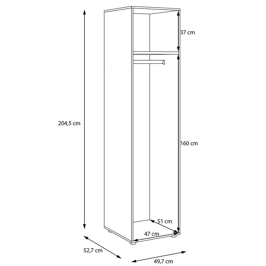Model o szerokości 49,7 cm, wysokości 204,5 cm i głębokości 52,7 cm świetnie sprawdzi się zarówno w mniejszych, jak i większych pomieszczeniach. Konstrukcja wykonana z płyty wiórowej laminowanej zapewnia trwałość oraz odporność na codzienne użytkowanie. Waga 31,6 kg świadczy o stabilnej i solidnej budowie.