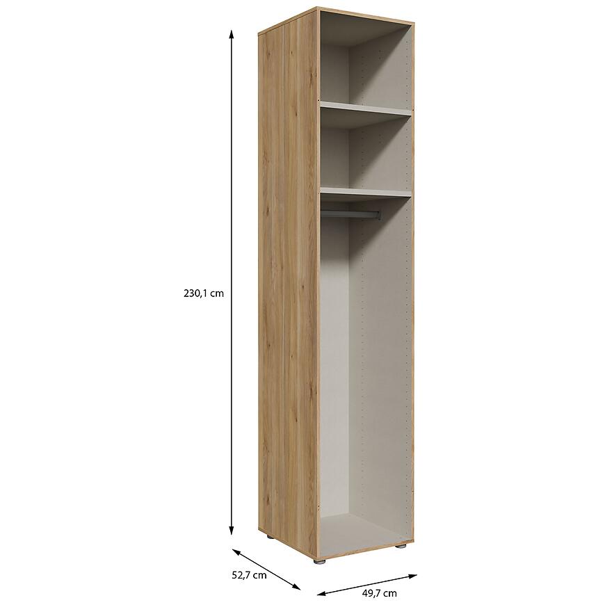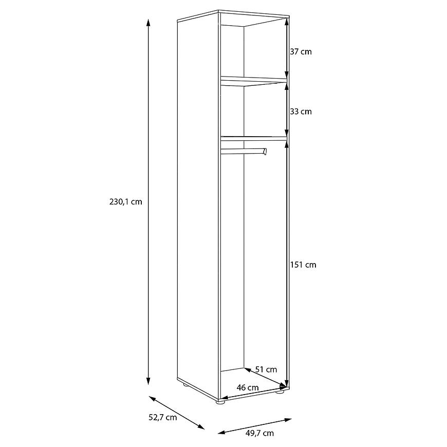 Dzięki wysokości 230,1 cm oraz szerokości 49,7 cm i głębokości 52,7 cm, korpus zapewnia dużą przestrzeń do organizacji ubrań i dodatków. Konstrukcja z płyty wiórowej laminowanej gwarantuje trwałość oraz odporność na codzienne użytkowanie. Waga 38,3 kg podkreśla stabilność mebla.